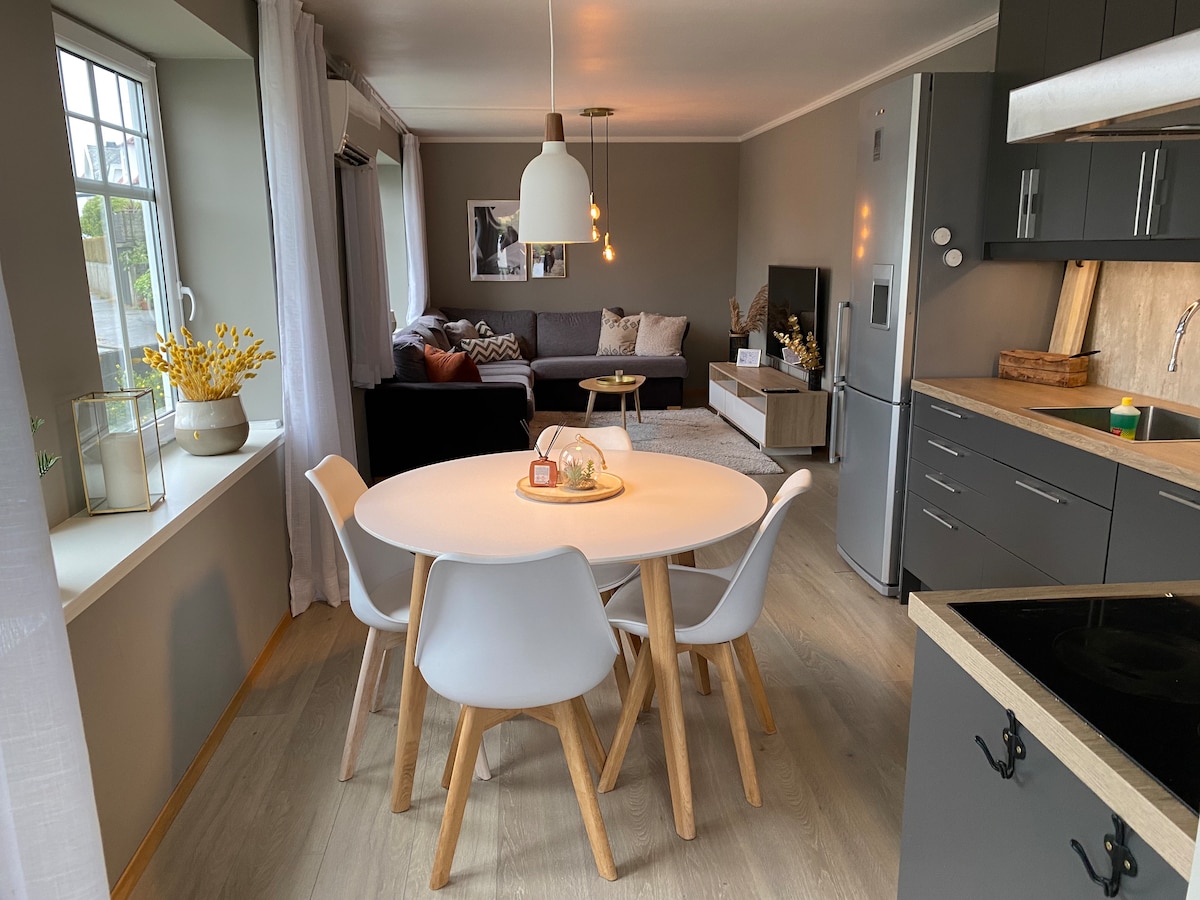 A wonderful two story apartment with first row view of the channel (Karmsundet) from the private balcony outside. Situated in a quiet neighborhood with walking distance to Haugesund city centre. The apartment is newly updated with calm green colors and original retro furniture. New 50" smart TV (wifi included), new washing machine and dryer are put in. Well equipped with dishwasher, microwave, toaster and shoe dryer for your convenience. You will find your tranquility here.