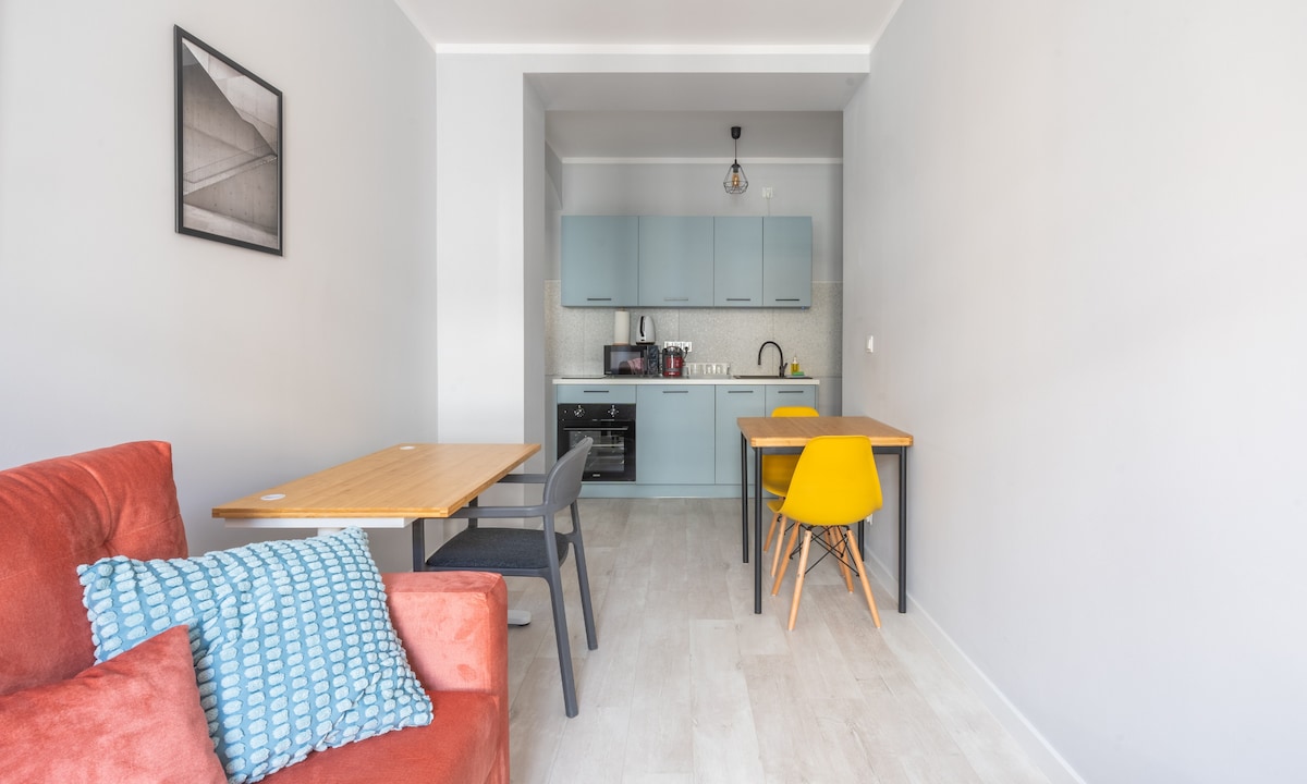 We invite you to a stylish apartment in the heart of Poznań at Swiety Marcin. The apartment is freshly renovated, designed by interior designers with attention to detail. It has a fully equipped kitchen, a beautiful bathroom, a large living room with a comfortable sofa, a table with chairs and a smart TV. The bedroom has a large double bed (160x200cm) and wardrobe. Apartment is located on first floor and is very quiet, because it is located in the courtyard.