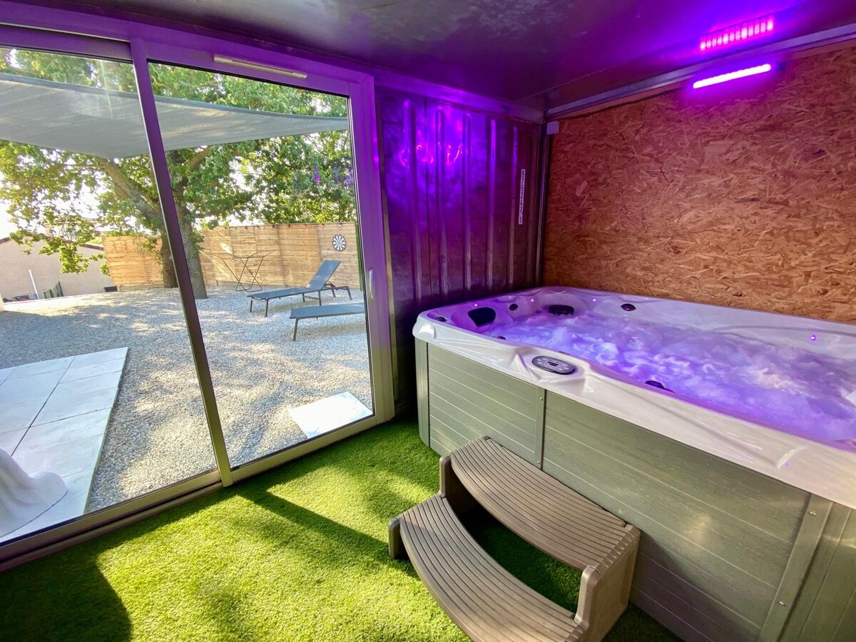 Unusual accommodation in a shipping container located in the Lauraga countryside. The container "at the foot of the oak tree" has a Jacuzzi, sauna and outdoor area with terrace, plancha, sunbathing and games. Inside: A fully equipped kitchen with dining area, living room with smart TV, One bedroom with king size bed, storage and TNT TV, Walk-in shower room Wi-Fi Numerous activities and places nearby. Great for a romantic stay!