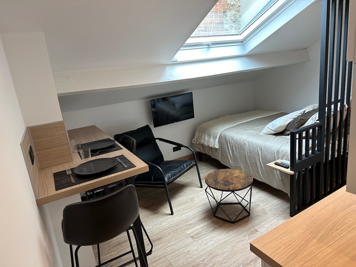 Large studio with a bedroom separated by a glass partition; in the city center, in a small quiet dead end, 5 minutes walk from the shopping district and 10 minutes from the castle. Lots of charm for this pied-à-terre ideal for hikers and climbers and nature lovers wishing to discover the forest massif of Fontainebleau. This apartment has all the comforts: small bathroom with shower and toilet, functional kitchenette, living room and bedroom.