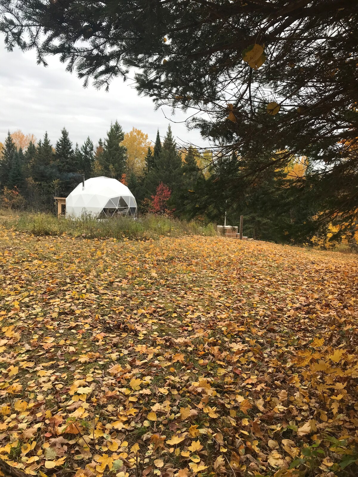The Meadow Dome is a private oasis surrounded by 98 acres of gorgeous nature you will have all to yourself. •NEW natural pool •Cedar cabin sauna •Chemical-free hot tub •Walking trails •Indoor fireplace •Outdoor fire pit Close to Algonquin Park Surrounded by thousands of lakes. Meadow Dome is an ideal spot if you want to unwind and enjoy nature at its finest. Meadow Dome is solar powered with wood heating and drinking water provided. There is a close by outhouse.