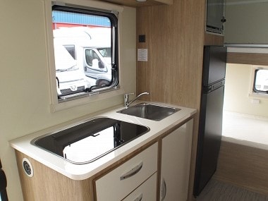 Alba comes to you with 6/7 berths including two fixed bunk beds and a fixed double bed above the spacious cabin. The two dinette areas convert to beds if required. There is ample storage space in the kitchen for the crockery and cookware which are all supplied within the hire price. There is lots of storage space in the rear garage that can be loaded from the inside or out side using the two lockable doors at the rear of the motor home.