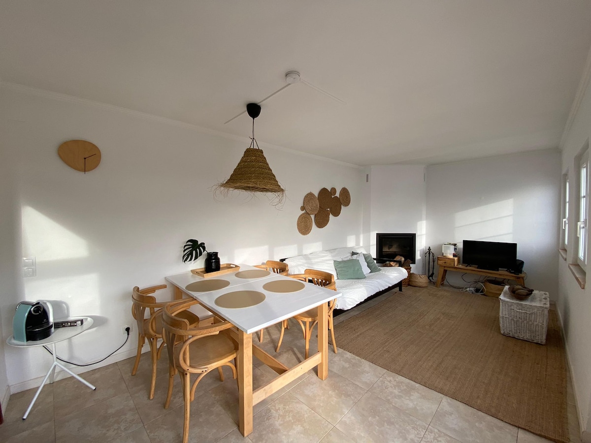 Apartamento reconstruído por arquitecto, excelente privacidade, exposição solar, com wifi, e praia a 150m. 1 suite com SPA e banho turco com aromaterapia. 1 suíte com terraço com vista mar, tela de projeção de cinema. Sala com vista de mar, rio, e terraço, onde poderá disfrutar de uma zona de estar e de um barbecue com grelha em ferro forjado. Perto de restaurantes, cafés e supermercado, e estação de comboio. Ar condicionado e piso aquecido em todas as áreas, TV 4K e box independente por suíte.