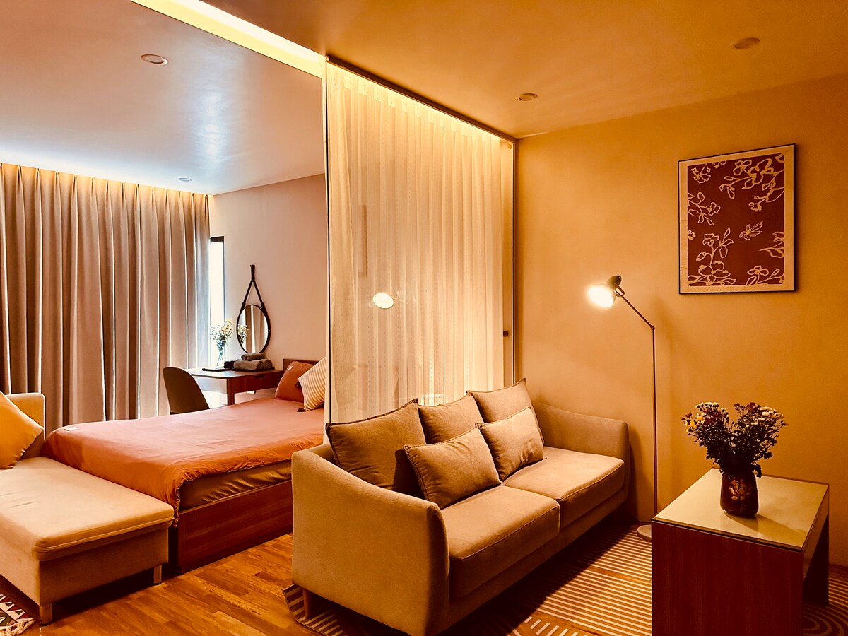 The 1 bedroom apartment for rent is inclusive of: - Full Furniture. - Household water consumption. - High-speed Internet access. - Two bottles of 19 liter drinking water. - Daily Housekeeping & Wet laundry service. (washing machine available) - Blanket and Linen change 1 time/ week - Receptionist 24/24. - Technician team & Security 24/24. - Motorbike Parking space. - Toilets and bathrooms are divided into separate rooms, 80L Water Heater fills the Bathtub.