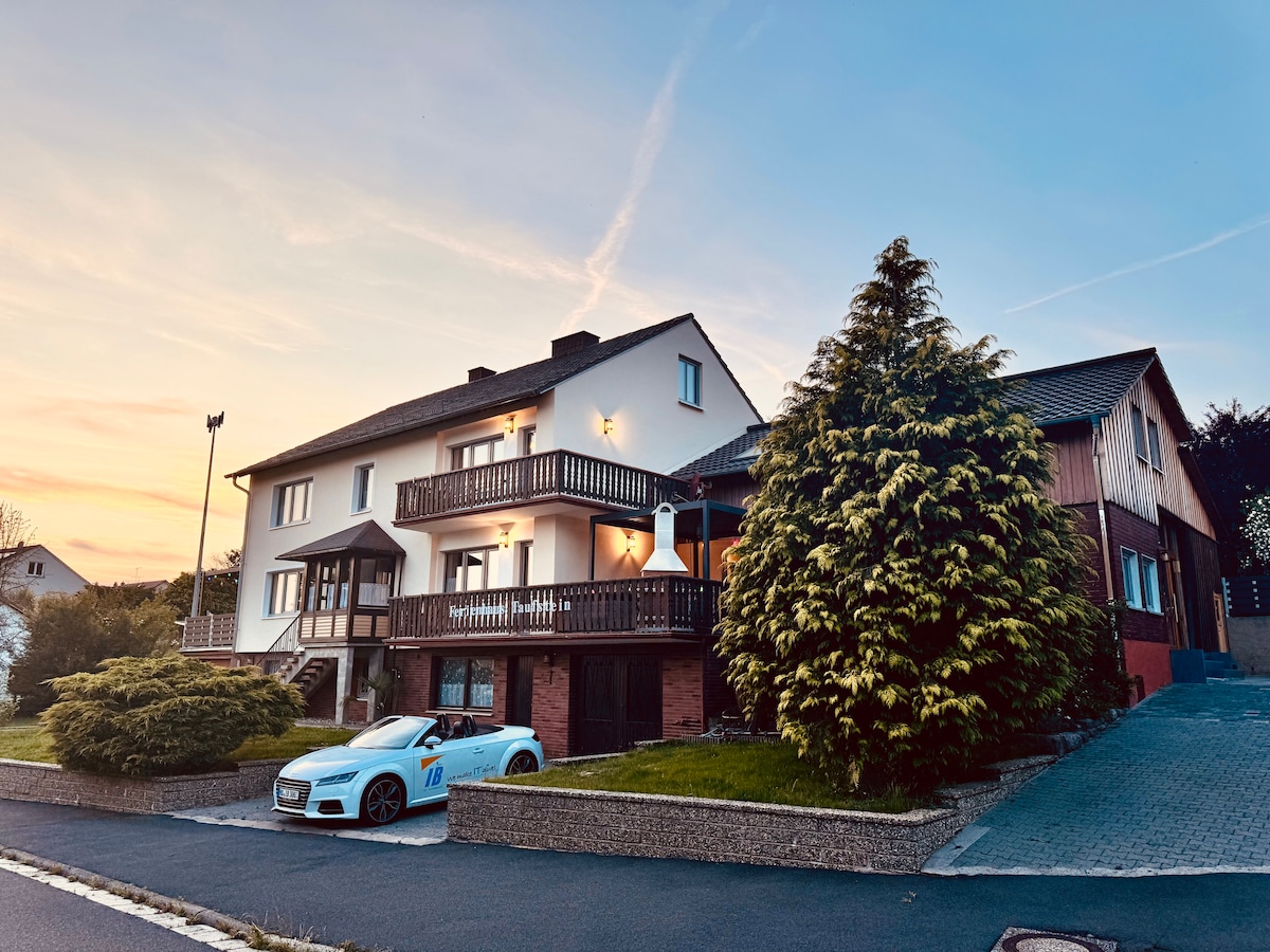 Willkommen im Gästezimmer Waldzauber – dein Rückzugsort mitten in der Rhöner Natur. Die liebevoll renovierte Wald Villa aus dem Jahr 1982 liegt auf einem 6.500 m² großen Grundstück direkt am Waldrand – umgeben von alten Bäumen und vielen gemütlichen Plätzen zum Verweilen. Ein gemeinschaftlicher Wellnessbereich mit Fitnessgeräten, Jacuzzi und einer großzügigen Sauna lädt zum Entspannen ein. Hier kannst du zur Ruhe kommen, neue Energie tanken und die Natur in vollen Zügen genießen.