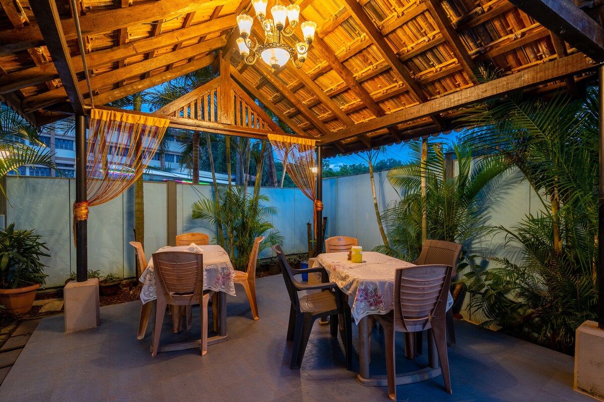 El Rosario 01 by The Blue Kite is a serene 2BHK is located on ground-floor apartment in Nerul with elegant modern interiors, a private garden with a hammock, and access to a common pool within a gated community. It features a spacious living room, a fully equipped kitchen, and two bedrooms with attached washrooms ideal for families or groups of friends. Coco Beach is just a 10-minute drive away, while popular restaurants like The Lazy Goose 10 min, The Burger Factory 6 min.