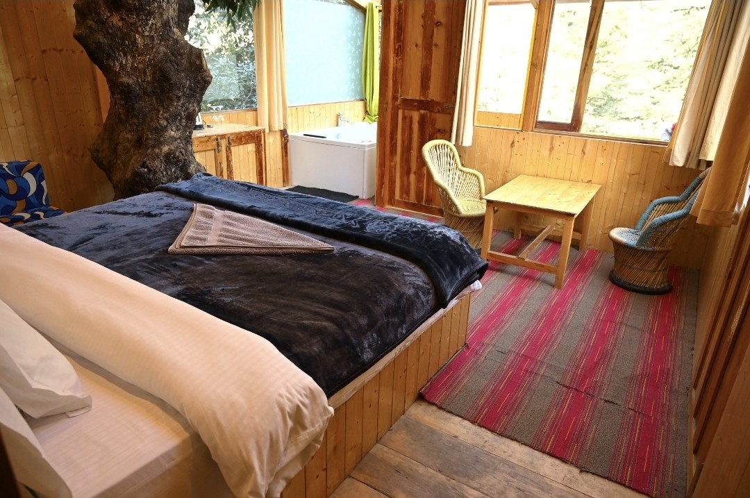 Perched amidst the pristine wilderness of the Himalayas, our Luxury Duplex Treehouse offers a one-of-a-kind retreat for those seeking both serenity and sophistication. Designed for discerning travelers who crave an immersive nature experience without compromising on comfort, this enchanting hideaway redefines mountain luxury. Experience elevated comfort in our luxury duplex treehouse featuring a private Jacuzzi in the bathroom, offering soothing relaxation with stunning mountain views.