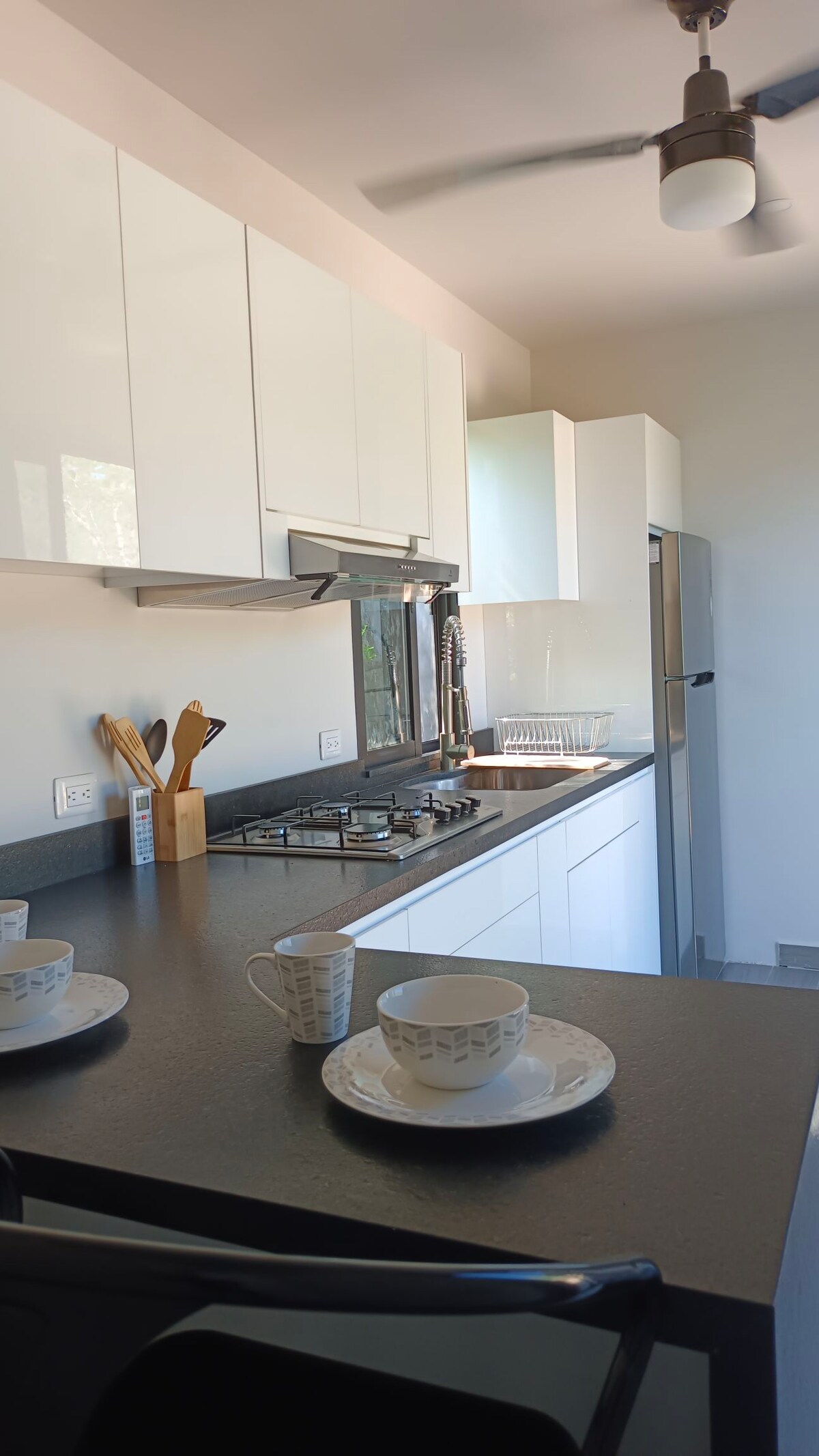 Mexican-flavored blend of modern design and natural beauty in centrally located 2-bedroom Casa El Teso. With 12-foot ceilings and steel-deck construction, this home is both strong and spacious. Large doors seamlessly connect the airy interior to the island-view patio. The shaded patio features a hot tub, BBQ, comfortable furniture, and a dining table. Inside, there’s fast WiFi and a remote workspace—perfect for working from paradise. ;-)