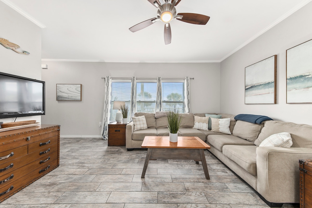 This elegant 1-bedroom, 1-bathroom residence is situated in the central hub of Gulf Shores, specifically in Moon Raker on Beach Blvd. The unit features a delightful palette of light, airy colors and tasteful beach-inspired decor. Guests are provided with a convenient street-level parking space. A grocery store, Pier 33, is just a block away, and popular dining spots, including the Hangout, are easily accessible on foot. The beach is conveniently located just across the street with dedicated access. Recently renovated, this unit showcases shiplap accents, custom ceilings, stainless steel appliances, and new flooring. It offers the added convenience of a pool and on-site laundry facilities.