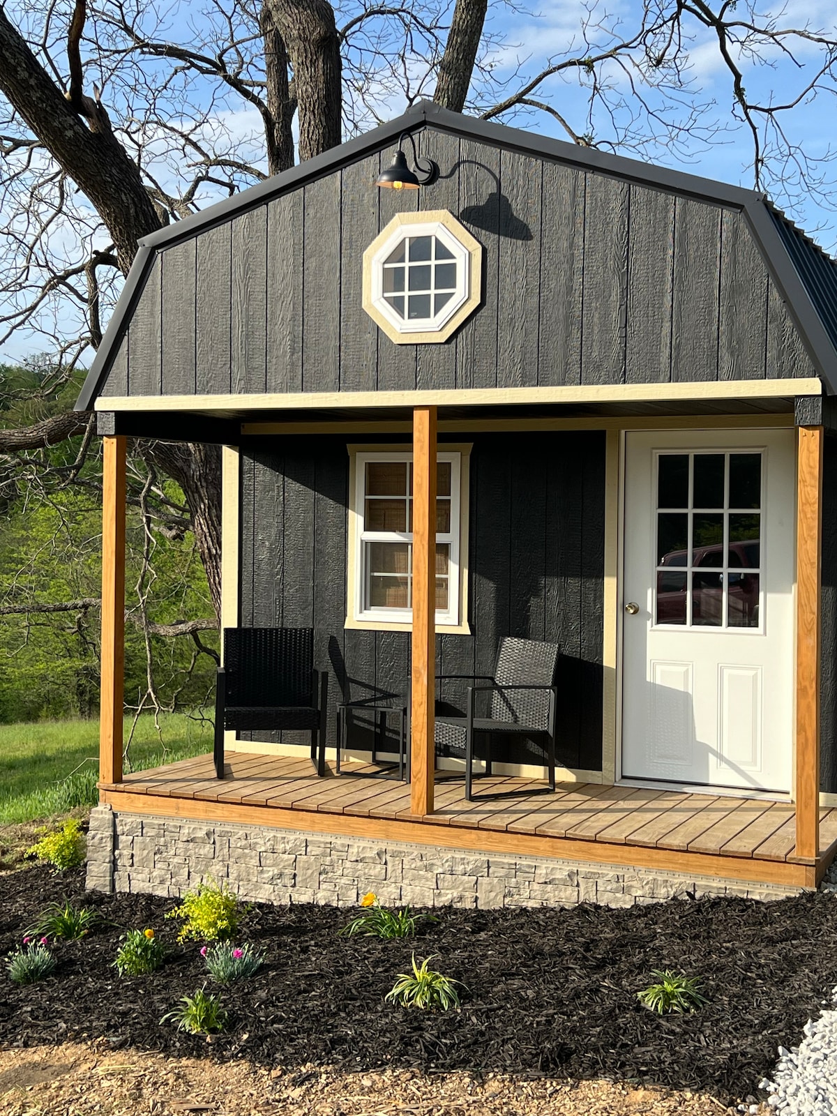 This is what you call glamping! Get away from it all when you stay under the stars at the Shot Glass Tiny House on wheels located at the end of a backroad surrounded by nature with a small stream out front approximately 3 miles from Maker’s Mark. You will be able to observe wildlife through the big picture window out front and surrounding windows throughout while staying comfortable as you glamp in the rustic style tiny house on wheels.