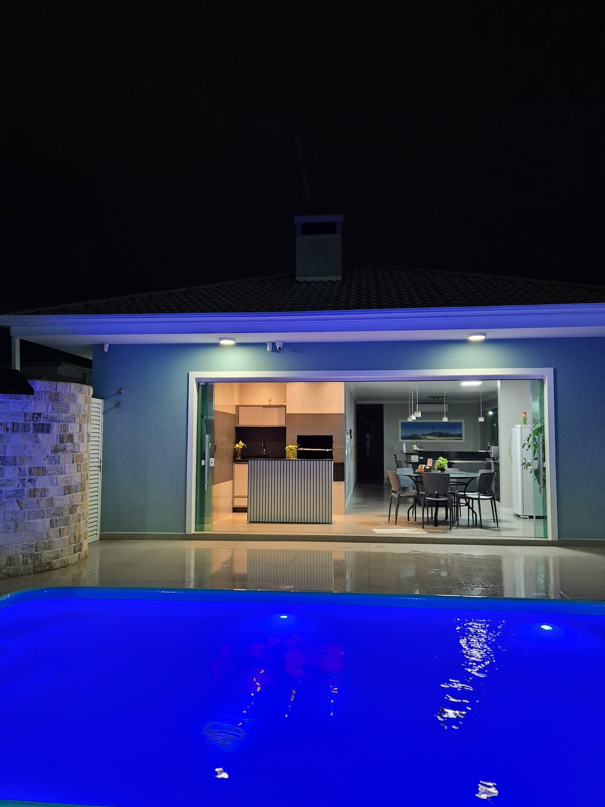 Two-story house with a large living room with a 65-inch multi-channel TV, Wi-Fi internet, dining room + American kitchen with 2 refrigerators, cook top, microwave and usual kitchen utensils, countertops with support chairs, 14-kilo washing machine, pantry, upper floor with 2 suites + 2 bedrooms, Suite with smart TV, Netflix, etc. Air conditioning, balcony, cabinets, glass box. Pool, barbecue gazebo. Second equipped kitchen. Barbecue, solarium, garage for 3 cars.