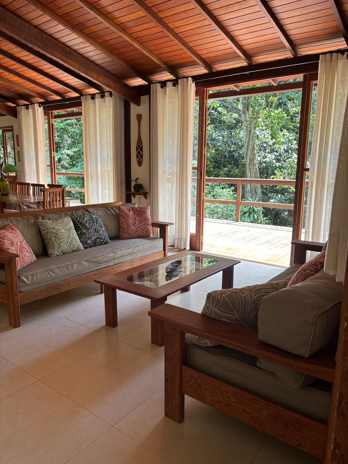 Entire house reserved, with beautiful rustic decor, surrounded by native forest and facing a sea of calm and crystalline waters. Great place for snorkeling, kayaking and swimming. It has a seaside deck to contemplate the beautiful sunset or see little fish and turtles. In addition, it has a game room with ping pong and darts. You will find an amazing and magical place that overflows with peace and good energies. Perfect to relax and connect with nature.