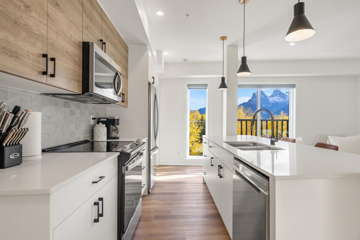 Mountain Paradise with 180° Views. This craftsman built complex boasts 3 private two-bedroom units, perfect for groups wanting their own space for a vacation, or to rent a unit individually. Picture yourself immersed in chic European styling with panoramic views of the rugged Canadian Rocky Mountains. Walk to restaurants, bars and shops downtown, or hop in the car for an easy 15-minute drive to Banff. NB: there is construction next to this unit so noise may be an issue during the summer 2024.