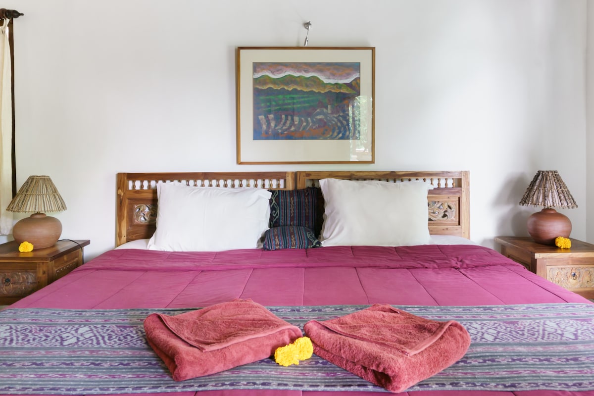 BREAKFAST INCLUDED Experience an architectural wonder at the exclusive 5 room boutique Ubud Art Villas. Indulge in the soothing sounds of the water fountain in the gardens of a home that also boasts flowing indoor to outdoor spaces, a private infinity pool, and on-site staff when required. PRIVATE VILLA - no access by others when groups in residence. Art Manor also available- 2 more rooms. 1 hour to airport, AC, Wi-Fi, vegan vegetarian food on request, book tours and transport, 15 minute walk to Ubud Centre, cafes including Alchemy, Yellow flower, Element, 50 meters NOMINATED FOR TOP HOST AWARD Welcome to Ubud ArtVilla. This villa is all about relaxation, authentic cultural connection, healthy food and the handmade. Natural environment and lifestyle is at the heart of our philosophy. Our gardens, bathrooms and style will connect you with comfort to nature. Our freshly prepared food will be served to you on handmade wood fired ceramics and artworks by the owner reflect Balinese culture and landscapes, as do the wooden artifacts and textiles. Our friendly family staff will make you feel connected to the Bali spirit with their smiles and attention to your needs. Wayan our manager, can be your guide and transport host to connect you to attractions, events and activities. Staying at the ArtVilla is more than accommodation. We will give you a complete Bali holiday and a genuine caring place to relax. We specialize in natural and cultural activities. Rafting, trekking downhill cycling, performances, dance and temple visits are just some of what we do. Airport or other hotel transfers are available on request. Located 1 hour drive from the airport. Ubud ArtVilla Boutique Guesthouse B&B Villa is a thatch roofed air conditioned townhouse occupying a prime position in Penestanan - one of Ubud's best known artistic hamlet garden estates. On the outskirts of central Ubud, Penestanan is famous for it's artists, sculptors, galleries, cafes and restaurants. There are little known pathways through ricefields and car free laneways to hidden cafes within 5 minutes walk. The ArtVilla overlooks rice fields with views of Mt Agung and Camphuan ridge. We are ideally located within easy reach, 15 minute walk, of the district of Ubud palace, markets and shopping streets, yet we are a haven of natural charm and quiet. Every large room is unique and equipped with air conditioning if needed, ceiling fans, lockable safe storage, indoor/outdoor garden bathroom, private courtyard or terraces onto the 12 meter natural rock swimming pool with waterfalls and rock landscaping. We have free wifi connection and music to enliven or relax you every day. We are the perfect place for a family or group getaway. or Yoga, meditation/ health retreat, Art, photography and pottery groups find us ideal. There is a fully staffed kitchen with fresh filtered water which we provide you to save money and buying plastic bottles. We try to minimize the use of any plastic bags and bottles. Daily breakfast is included. Menu for extra lunch and dinners is available in the dining area or wooden bale garden retreat. We prefer you not to smoke within the compound. Strictly no smoking in the bedrooms and main living areas. Sorry no loud drinking parties. We will welcome you to our beautiful home with complimentary drinks. This listing is for the whole 5 bedroom villa. If you require 1, 2, 3 or 4 rooms please see our other listings or contact us for pricing. Whole villa authentic style with private pool. Amazing views privacy gardens and quiet. Satellite TV and DVD in every room Great Aircon Beautiful details and gardens Wayan and the staff are there for your every need. 15 minute walk to Ubud Palace. Cafes, warungs, and boutique clothing and art shops are within 50 meters of the property's front gate. Penestanan is a thriving artistic hamlet above Campuhan River and is close to the Blanco Museum. Check exterior photos for our unmatched quiet position and views. We can organise all your transport or taxis are available from our front gate. Motorbike and pushbike hire available. You can walk into Ubud centre or discover hidden laneways and cafes close by. Hidden pathways and lanes to great cafes and Warungs from our back gate.
