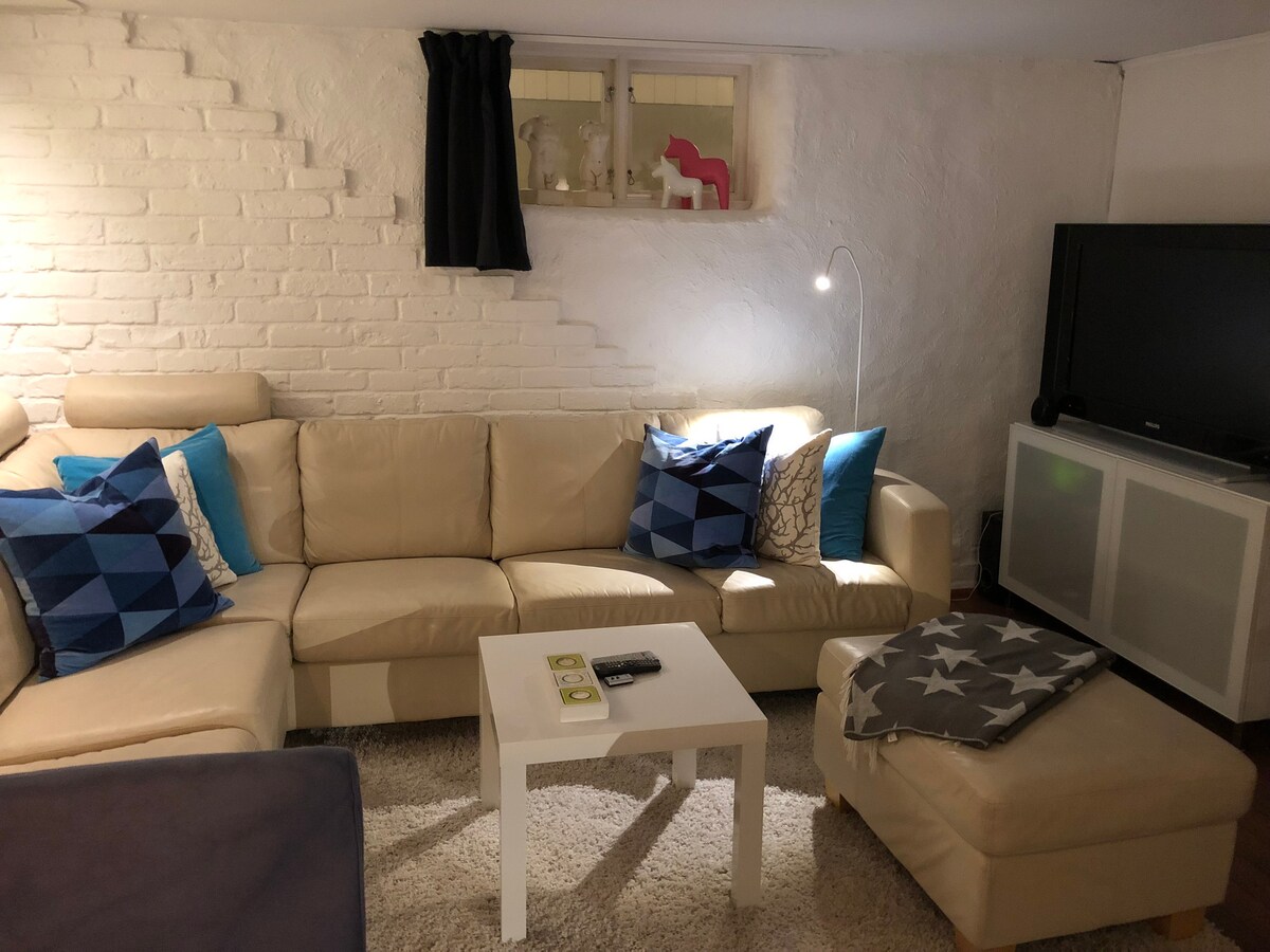 Unique and charming apartment with 2 rooms and kitchen, 60 square meters. Completely renovated with a modern feel. Spacious kitchen for cooking and socializing. Bedroom with a comfortable double bed and queen-size sofa bed. Perfect location – central with excellent transport connections. Only 10 minutes by bus! Digital code lock for easy check-in and check-out. Good WiFi and free parking in the area. The apartment is of a high standard and located in our basement and has a frosted window. The apartment has a separate entrance from the house.