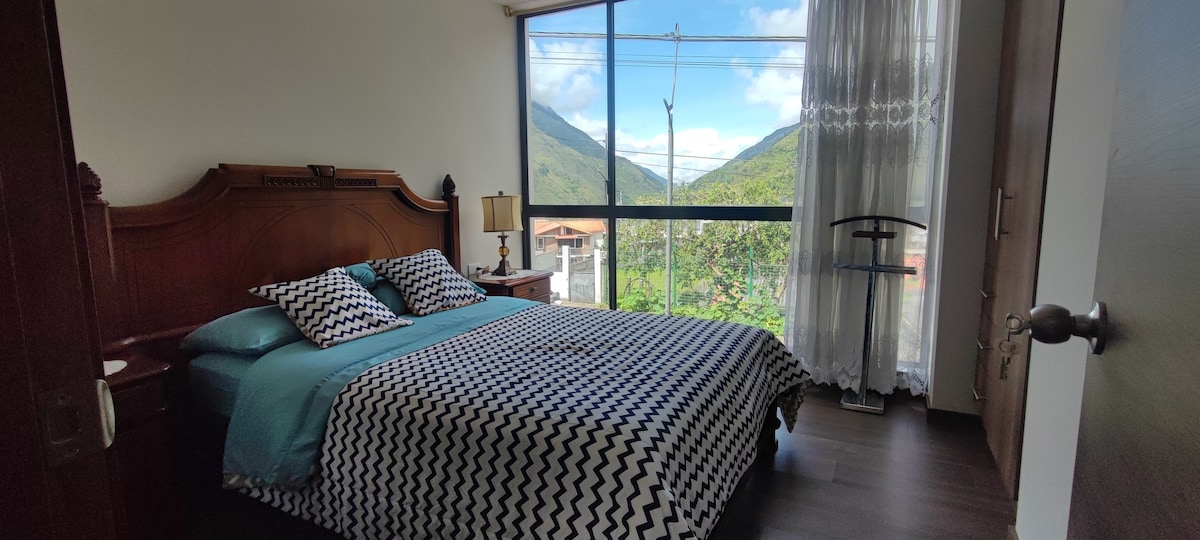 ▪︎Lugar único cerca de todo. ▪︎ Excelente ubicación a 150 metros de la Basílica Virgen de Agua Santa, hermoso departamento con terraza, habitación matrimonial con baño privado y balcón. ▪︎Habitaciones familiares con baño completo, baño social, paradisíaca vista nocturna a las montañas, con servicio de agua caliente, cocina, comedor,sala con balcón, NETLIFE WIFI, YOUTUBE, TV CABLE y juegos de mesa. ▪︎Parqueadero privado.