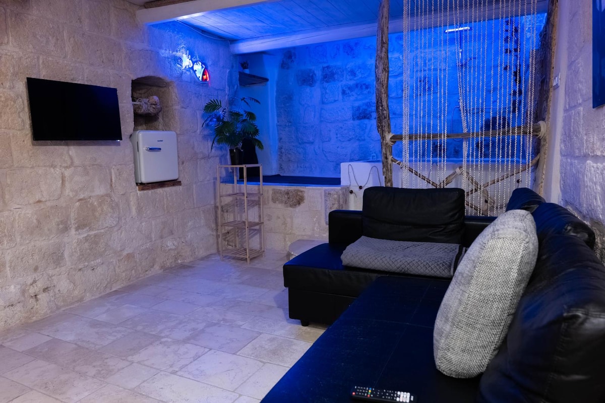 La camera è confortevole, curata nei minimi dettagli arredata con toni bianchi e crema. Sono state realizzate utilizzando materiali naturali, come il tufo, caratterizzate da un’architettura tradizionale pugliese. La camera è composta da zona cucina e pranzo, bagno privato con doccia e prodotti da bagno, camera da letto. E' climatizzata, dotate di Wi-Fi gratuito, Smart TV, set di cortesia, circondata dal giardino, con accesso al mare, che si affaccia sulla Lama Monachile.