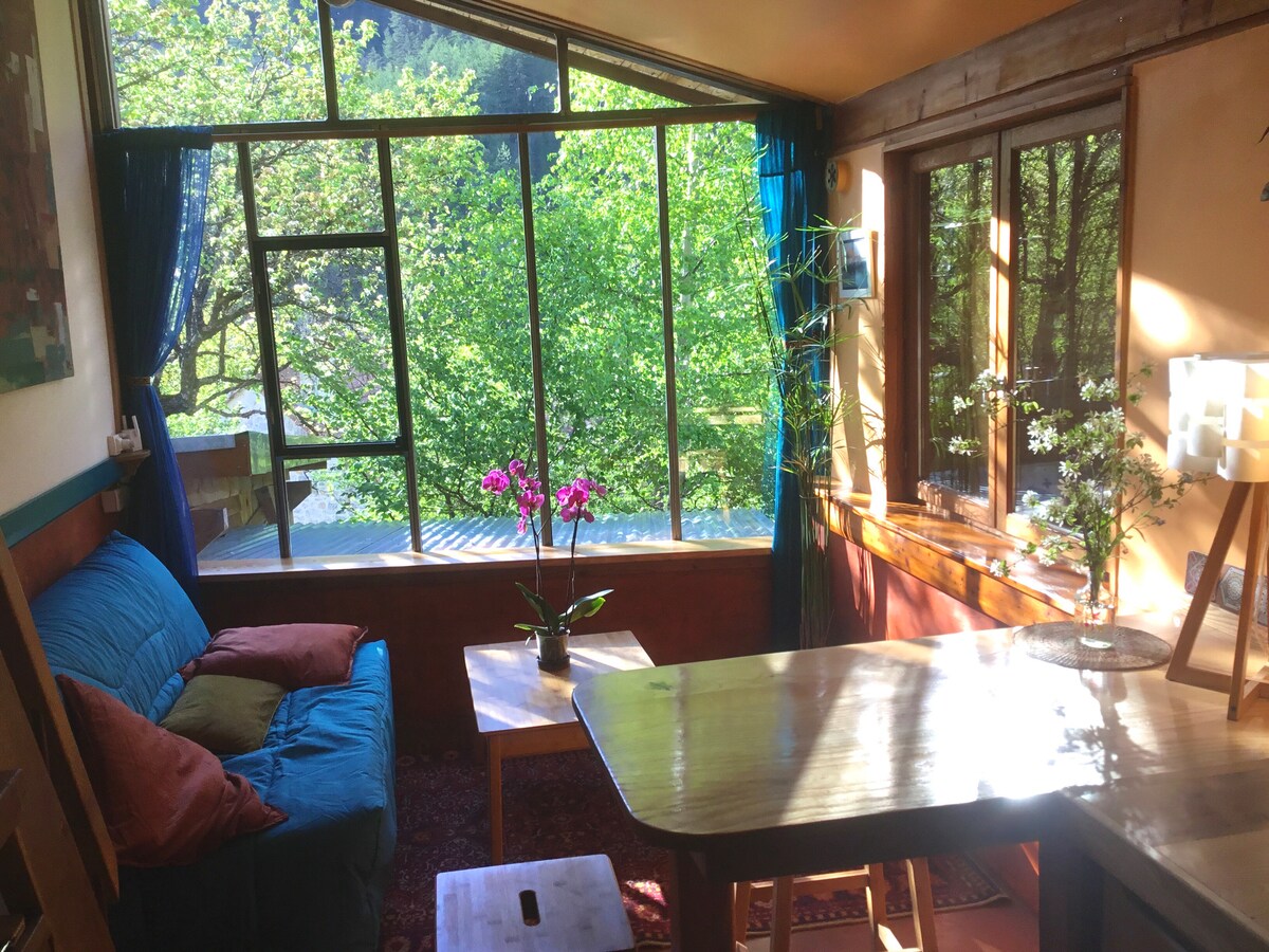 35 m2 cottage with garden and stunning views of the southern slopes of Vercors. A stone's throw from the city center of Die (500 m by the pedestrian walkway), by the river, you are in the countryside and in the city! On the ground floor of our house, our entrances are opposite: you are quiet, but we are there if necessary. You will find books and films made here and elsewhere, and works of art on the walls: we are also publishers... Eco-friendly gîte (phyto-purification, organic garden, chickens, recycling...)