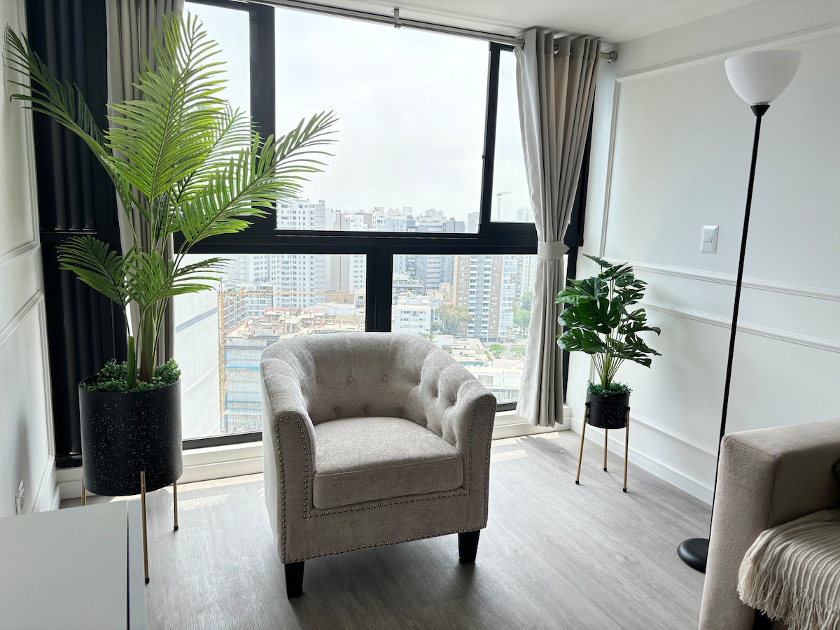 **Brand new apartment. Most central area of the city, steps from San Isidro** 100% equipped, beautiful common areas such as gym, terrace, rooftop grills, spectacular view. Centrally located and perfect for getting around Miraflores, Barranco, Lima Centro. Close to malls, entertainment venues, and restaurants. 8th floor of a modern 25-story building, with wifi. Fully equipped kitchen, bathroom and a bedroom with a queen size bed. Entry with key and smart lock