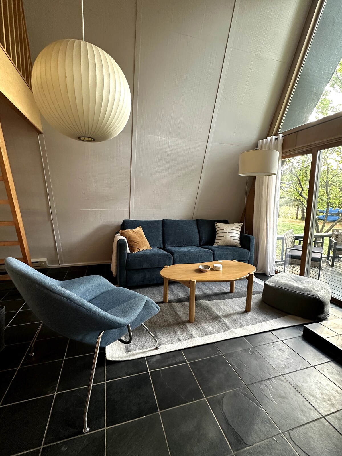 A cozy A-frame cabin tucked in the woods on 13 private acres along the Hay River. Deeply secluded retreat designed for slowing down, reconnecting and finding inspiration, 90 min drive from the Twin Cities. The setting offers rare privacy and a sense of calm that’s hard to come by. Spend your days paddling beneath rock formations, warming up in the wood-fired sauna, relaxing with a book by the fire, watching the wildlife go by, and experiencing a peaceful, restorative escape in every season.