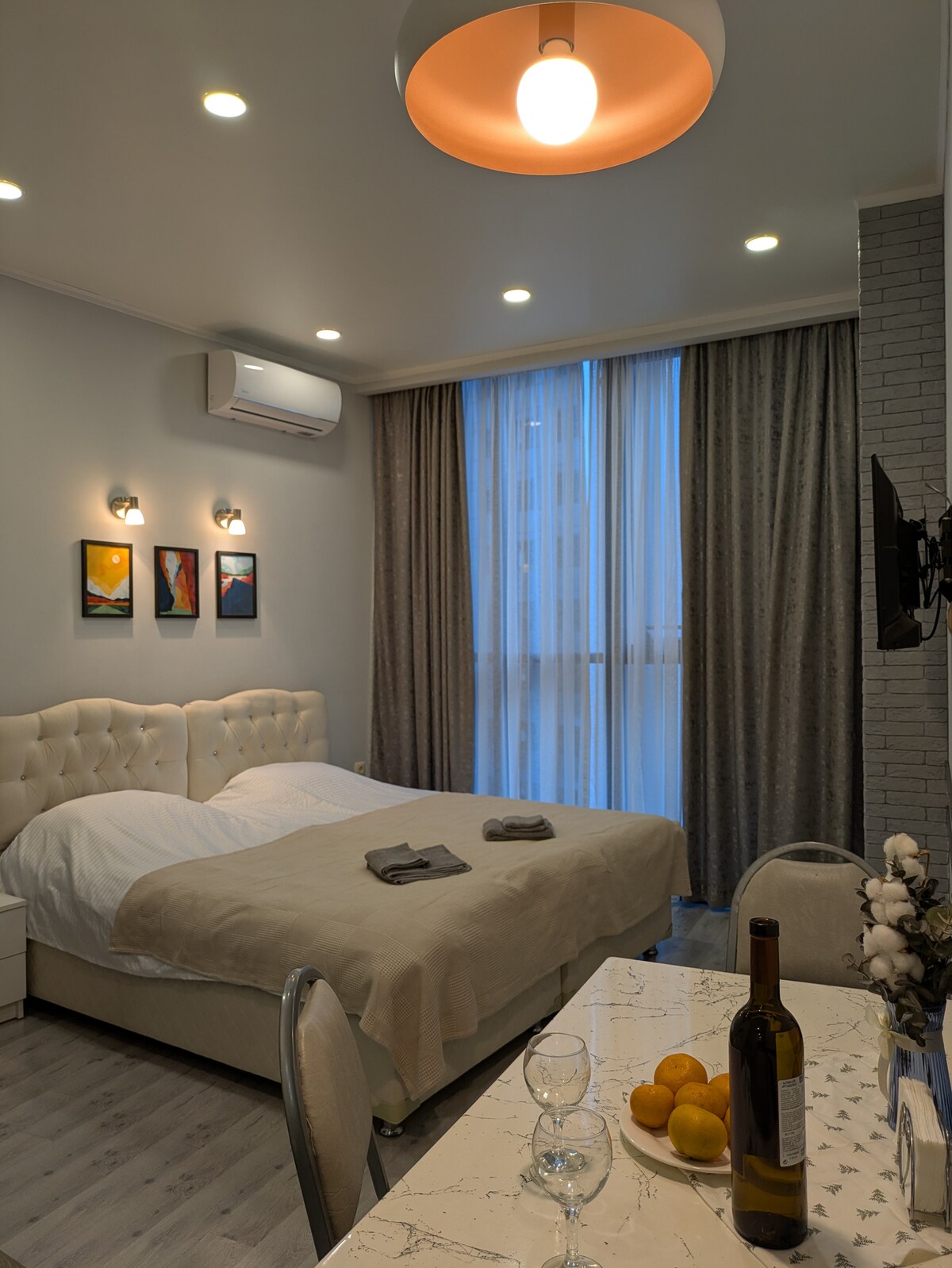 This beautiful contemporary studio flat is just 2 minutes walk from the city's cleanest beach, 5 minutes walk from city central square and all touristic areas, cafes and restaurants. King sized bed with all glass window for nocturnal sky and city gazing. The kitchen is fully equipped with everything you will need. It's wonderfully quiet and secured with high security systems. There is a bike hire station just 20 seconds away, perfect for a cycle along Batumi Boulevard.