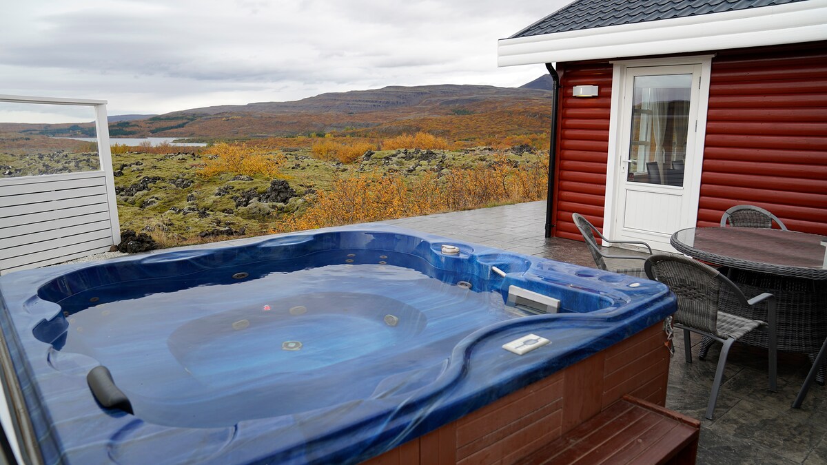 Wooden, warm house for six people. Perfectly integrated into the lava field at the foot of the extinct GRABROK volcano, which you can enter almost straight from home :). Beautiful views and silence. Only the sounds of nature can be heard. An ideal place to observe the northern lights (no city lights). Just 300 meters from the main road No. 1. Fully equipped kitchen. Perfectly clean drinking water flows from the tap. The jacuzzi is already working :) There are bubbles and it's nice :) !!!