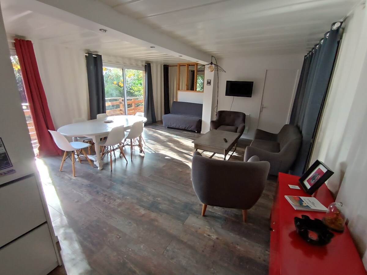 40 m2 mobile home with air conditioning and radiators _ large living room, living room with TV, sofa bed for 2 people _kitchen with dishwasher, oven, stove, fridge freezer, hood _ coffee maker, kettle, toaster and cookware for 8 people _1 master bedroom with large dressing room _2 bedrooms with 2 single beds, closet in each bedroom _duvets, pillows and mattress protectors provided _bathroom, washing machine and separate toilet _terrace 18 m2 covered closed, plancha
