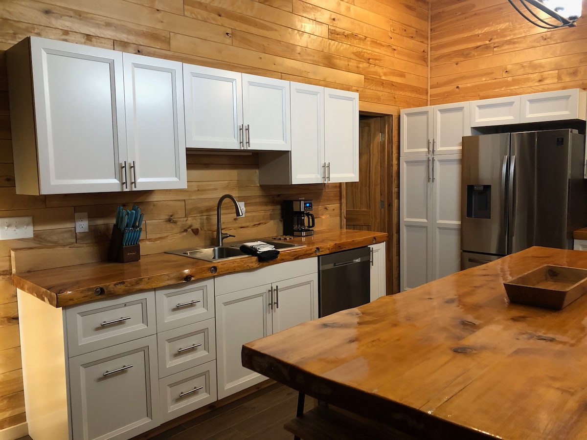 Modern, rustic, Aframe cabin on 10 wooded acres; beautiful, simple décor, fully equipped kitchen, all appliances, glass stove top, airfryer oven, filtered H2O/ice maker. Enjoy a luxurious bathroom, with a heated tile floor, walk-in shower. Towels, shampoo/conditioner/bodywash are provided. King bed in loft and NEW king bed on main floor. Smart TV, wifi. Books, games The Woodstove heats the cabin perfectly in the colder months. All wood provided. There is also a minisplit heat/ac unit.