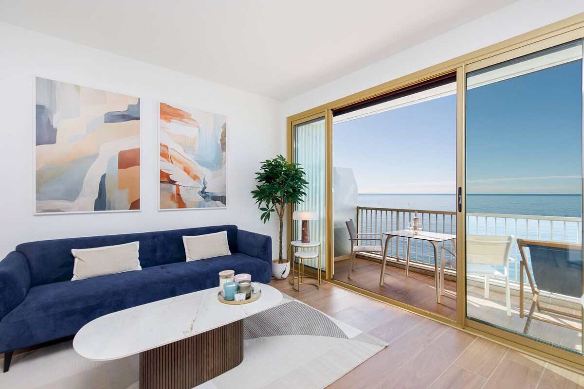Fully air-conditioned. ELEVATOR Free private secure parking. On the beach. Exceptional view of the Cap d 'Antibes and the Lerins Islands. 5th floor. Large apartment. Two bedrooms, two bathrooms, 2 WC.Neuf. renovated in 2024. Free, secure parking! Direct access to the sea. No noise as it is a pedestrian zone. A 5-minute walk from the train station. Very quiet. No road. All shops and restaurants are right nearby. After a year of work, Juan-les-Pins Beach has been renovated and looks fantastic!