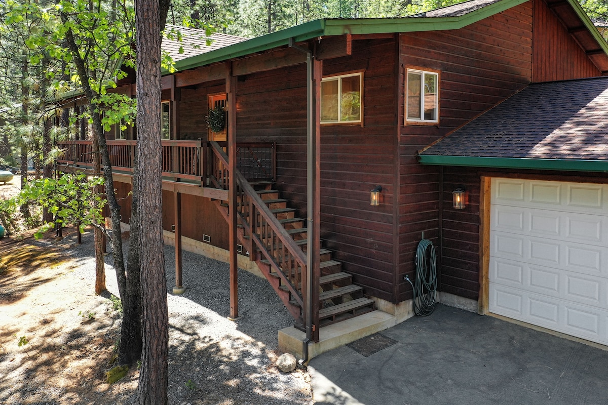 Escape to The Chalet Getaway - a 1970s cabin that waits to wrap you in warm vintage vibes. The 20 foot bow front windows provide great views of the surrounding blue skies and beautiful trees. The large deck is a front row seat to the bountiful sights and sounds of nature, and is perfect for stargazing from the hot tub. Connect with loved ones in this cozy, nostalgic setting. 10 minutes to stunning Pinecrest Lake, 15 to Dodge Ridge. Surrounded by loads of fun outdoor activities.