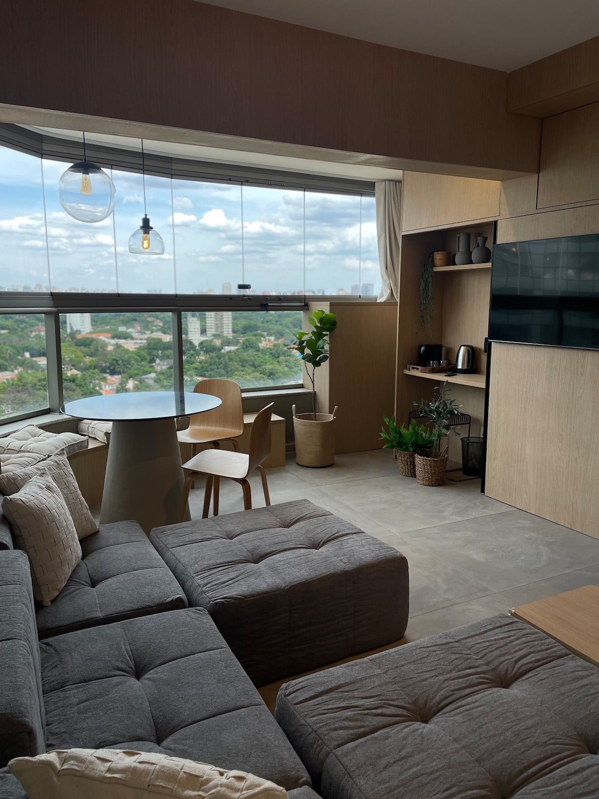 Boutique studio with one of the most beautiful views of São Paulo city. Placed 2 minutes walk from the subway. Fully equipped kitchen with refrigerator hidden by wooden door. Wi-fi, air-conditioning and smart TV 55 inches. Self check-in with smart electronic lock. Play tennis or go o gym and relax in the pools (outdoor or heated indoor) and saunas (wet or dry) afterwards. Common area also includes co-working spaces and laundry. Visitors need to be previously registered at the front dest.