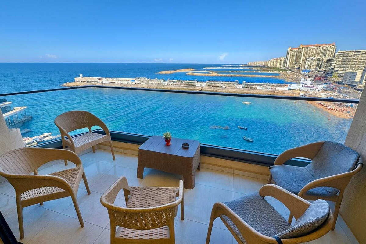 Your Luxurious 14th-Floor Mediterranean 🏖️!Getaway in Alexandria Imagine waking up to panoramic sea views from every corner of your apartment – even !from your bed Designed to maximize your sea experience, this spacious apartment is perfect for .families A room with three 120 cm beds.The other room has a 120 cm bed and a 170 cm beds "Dining, reception, living areas offer breathtaking sea views (West, North, East), perfect for enjoying cool breezes, ideal for soaking in warm sun."