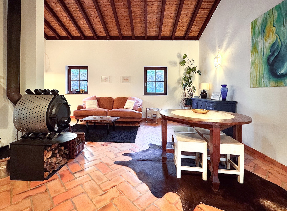 Among the green hills of Southwest Alentejo Natural Park, along the Rota Vicentina trails and just 20 km from the wild Atlantic coast, this peaceful studio enjoys over 300 days of sunshine a year Located in the small village of Castelão (São Luís), the fully renovated studio is attached to our family home but offers privacy. It’s perfect for a couple, with an open bedroom, cozy living area with pellet burner, fully equipped kitchen, bathroom, and a private outdoor space with beautiful views.