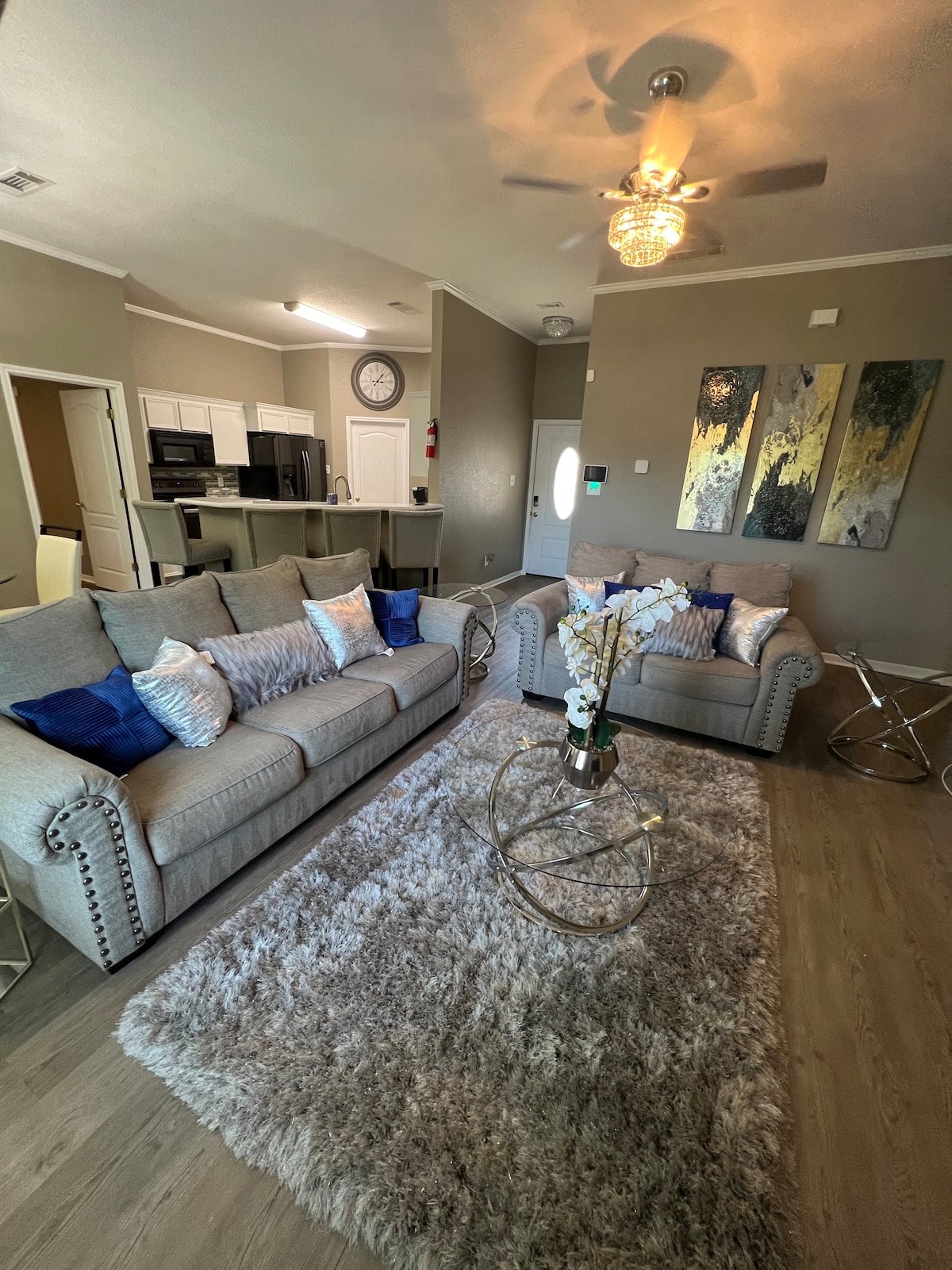 Mediterranean Style Home in community w/Country backyard view. Close to Fort Hood/Shopping. Complimentary bottle of wine! Office Space. King Master Bed, Walk Through Shower/Soaking Tub (No Whirlpool Jets). 2 Queen sized beds. 3 TVs w/Roku for streaming. Keurig (K-Cups provided),Full Size Refrigerator AND Mini Fridge, 2 patio w/seating, Gas Grill (1 time 15.00 fee to use). Electric LR Fireplace. WIFI. NO PETS. Exterior lighting/outside cameras on the property for safety. Treadmill upon request.