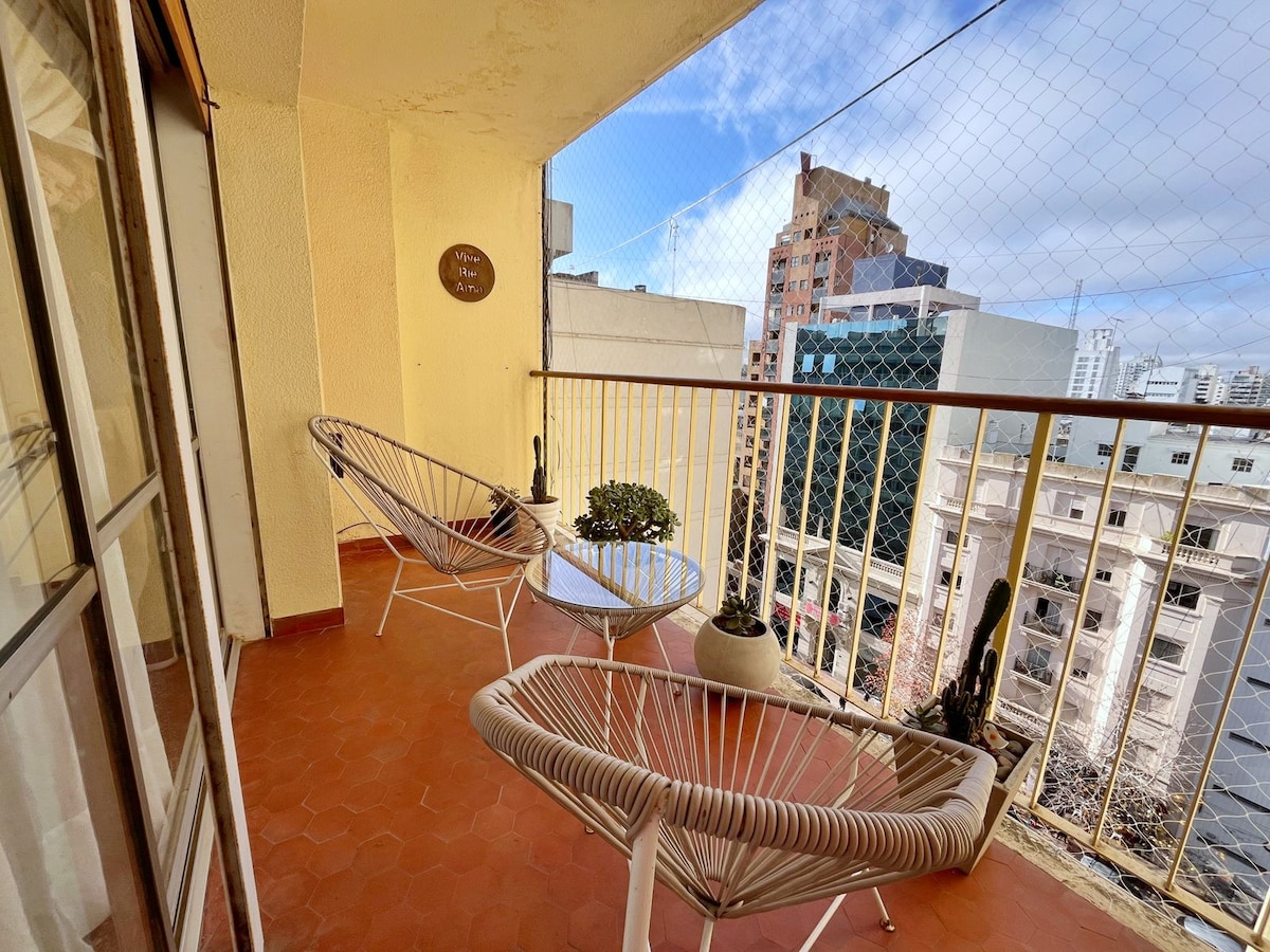 Relax in this beautiful and quiet apartment on the 8th floor, modern, bright, airy with an amazing view. Bedroom with queen size bed, blackout curtains, closet with safe, full bathroom and dressing room. Equipped with: refrigerator, freezer, electric kettle, coffee maker, toaster, kitchen with gas oven, microwave, large sofa bed, 50" and 32" Smart TVs 7 blocks from the train station, 4 from the bus terminal, and a five-minute drive to the highway exit.