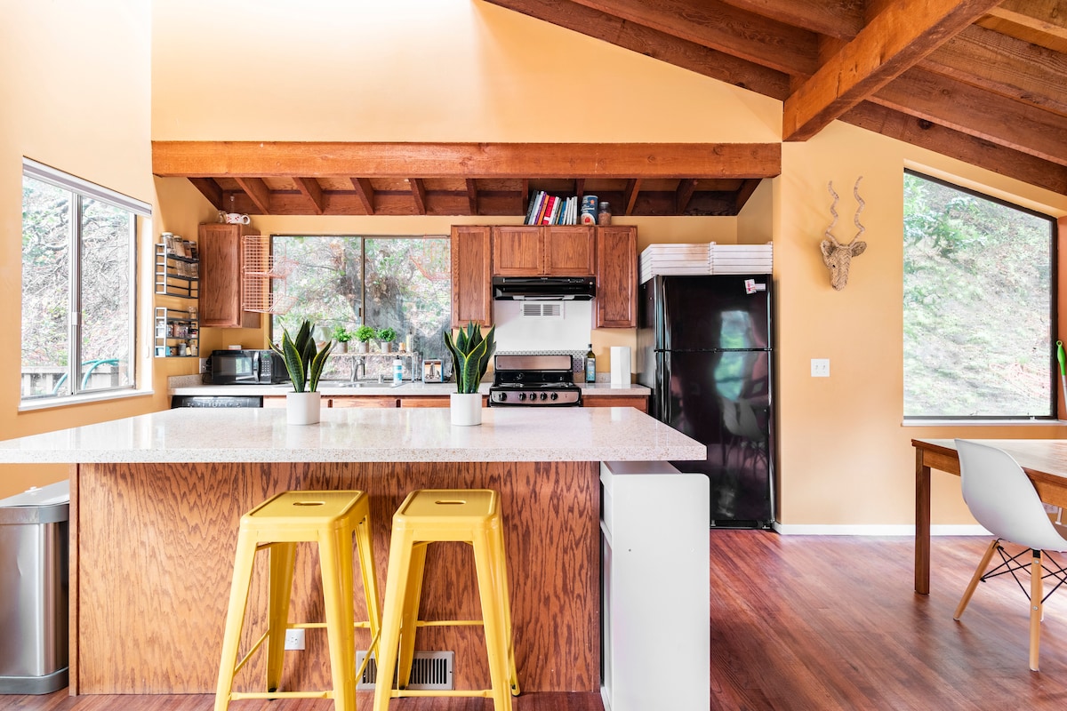 An open-concept, one-bedroom, 2-story home in University Uplands. Pleasantly tucked into Claremont Canyon. This home was built in 1969 and belonged to renowned architectural historian Spiro Kostof. It is a peaceful space tucked against the hillside, surrounded by nature. You’ll feel like you’re staying in the country, when in fact, you’re only 5 minutes away from UC Berkeley and BART, with easy access to San Francisco.