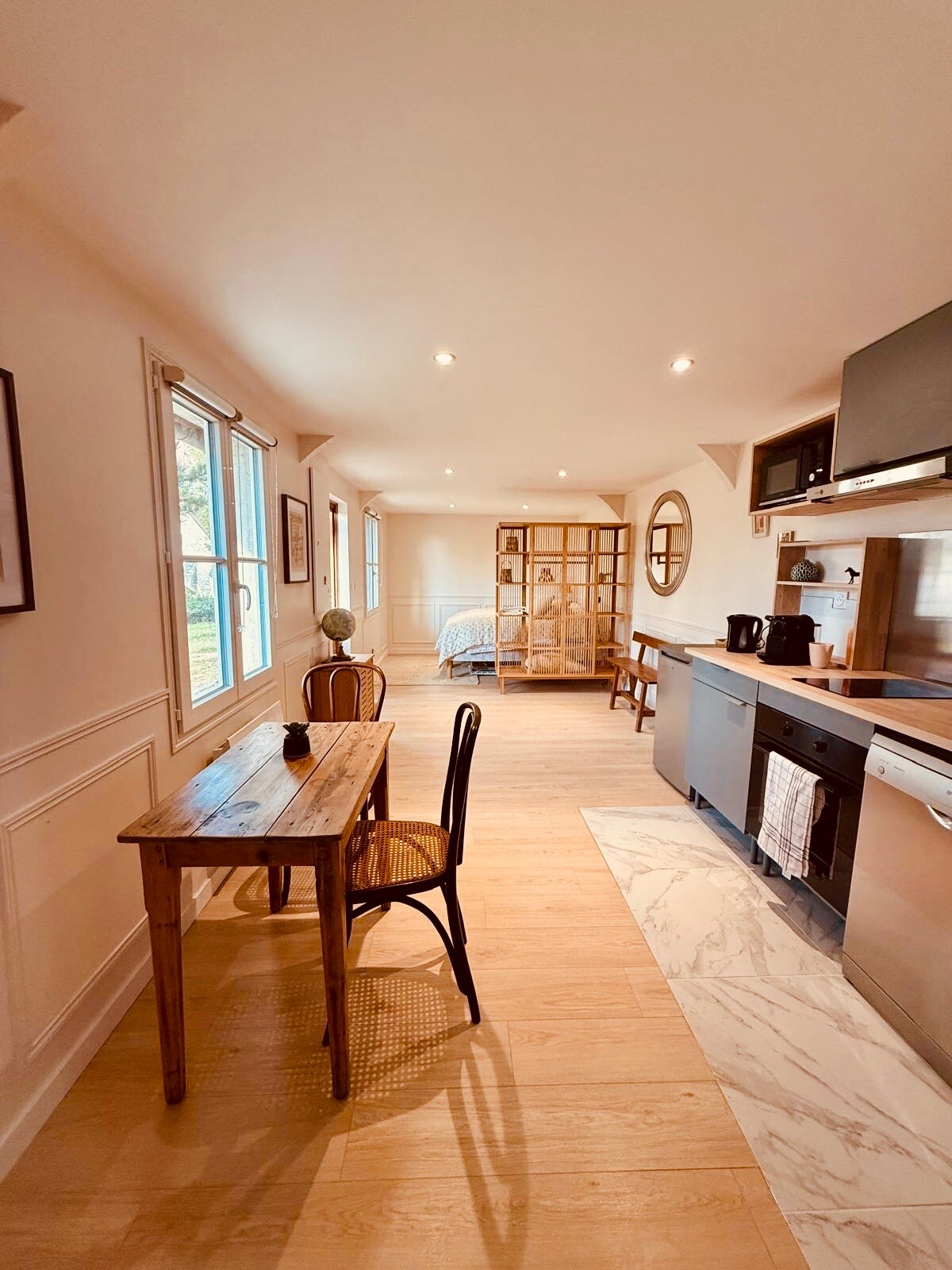 Venez vous ressourcer dans ce bel appartement de 50m2 totalement conçu en open-Space, salle de bain ouverte sur pièce principale. Profitez éventuellement d une coupe de champagne dans un BAIN A REMOUS,et endormez vous sous un ciel étoilé.. Profitez également de la terrasse pour un petit bol d air le soir, ou pour prendre votre petit déjeuner face a la nature.. Tout pour se retrouver en amoureux ou en solo le temps d’une soirée paisible. n hésitez pas a nous contacter pour des demandes diverses