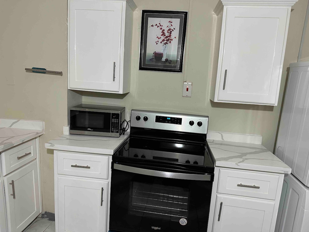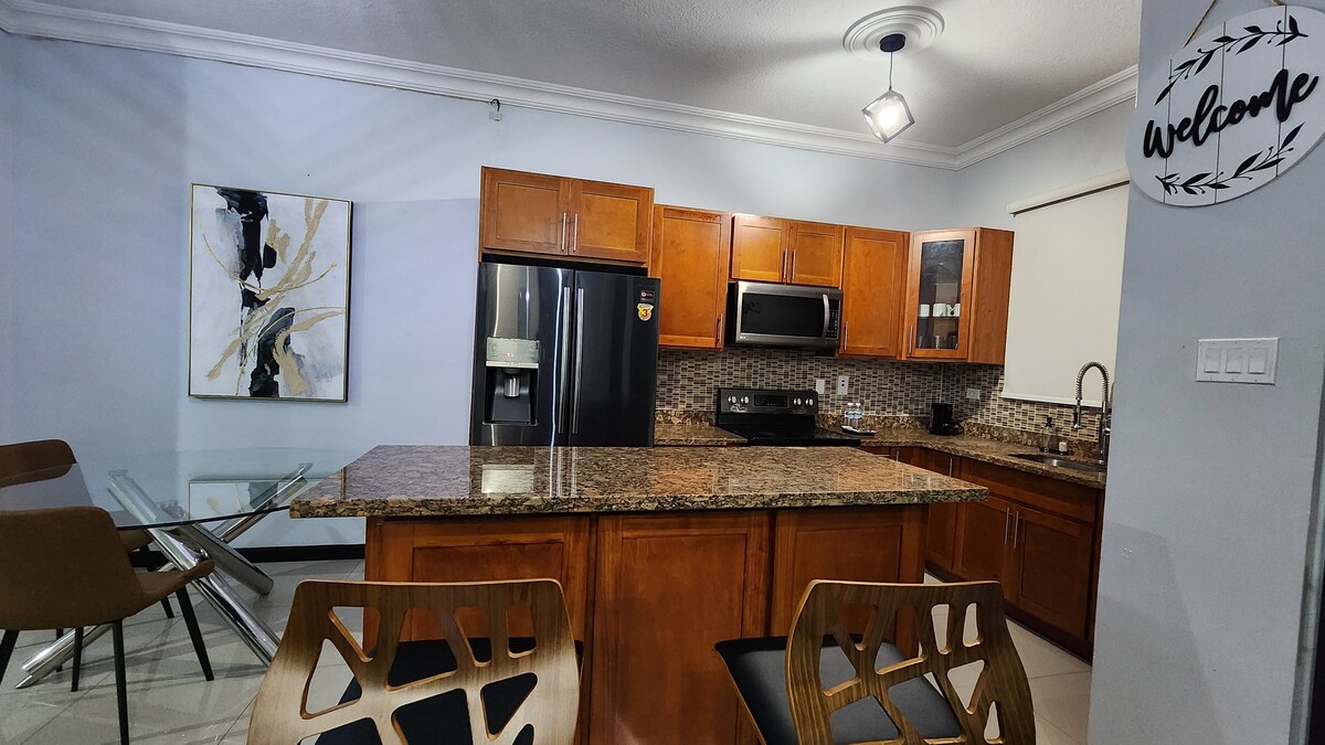 Enjoy a place where you can ' Just Breathe'. An oasis in the city, where you can relax yet, get serious work done. Equipped with all the modern amenities whether for overnight or an extended stay. In this kitchen, you can whip up anything your heart desires. Relax on the patio in the morning to 'breathe' in the fresh morning air or enjoy the evening breeze. The condo is centrally located across from the National Stadium, not far from the airport, easy drive to New Kingston and Liguanea.