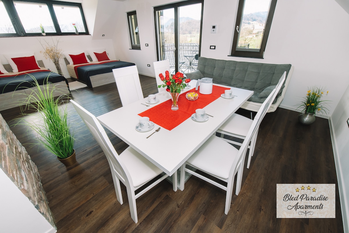 This apartmant is on the middle floor , it consists of a kitchen with bedroom and a bathroom (studio) . House is located in one of the best area in Bled, just a few minutes from Lake Bled and city center. You live alone in the apartment and its not shared with other guests. Guests can use a shared washing mashine in the house. We offer a self check in option , if your arrival time is unkown or out of check in hours. Guests need to pay turist tax upon arrival (3,13e )