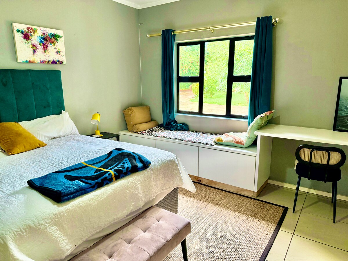 Escape to this spacious cottage nestled on a farm in Malkerns, bordering the stunning Mlilwane Wildlife Sanctuary. Surrounded by nature and often visited by game along the fence line. Enjoy coffee on the veranda overlooking a small dam and watch impalas or zebras grazing nearby. The cottage is thoughtfully furnished for comfort and simplicity, with open-plan living, a well-equipped kitchen, and beautiful views from every window. Well placed for Bushfire and Luju Festivals.
