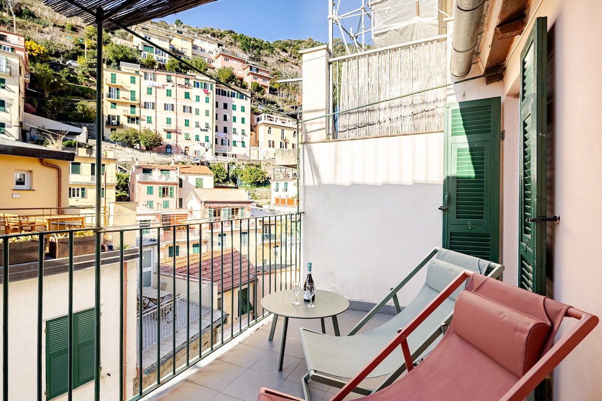 (CITRA code 011024-LT-0166) Bright apartment in the center of Riomaggiore, with an exclusive outdoor space equipped with an umbrella, a table for dinners and lunches in joy, comfortable deck chairs for moments of relaxation in the company of a nice book. The apartment consists of a large living room with a comfortable double sofa bed and a study corner, TV, wifi and air conditioning, an equipped kitchen, a double bedroom with air conditioning, and a bathroom with a large shower.