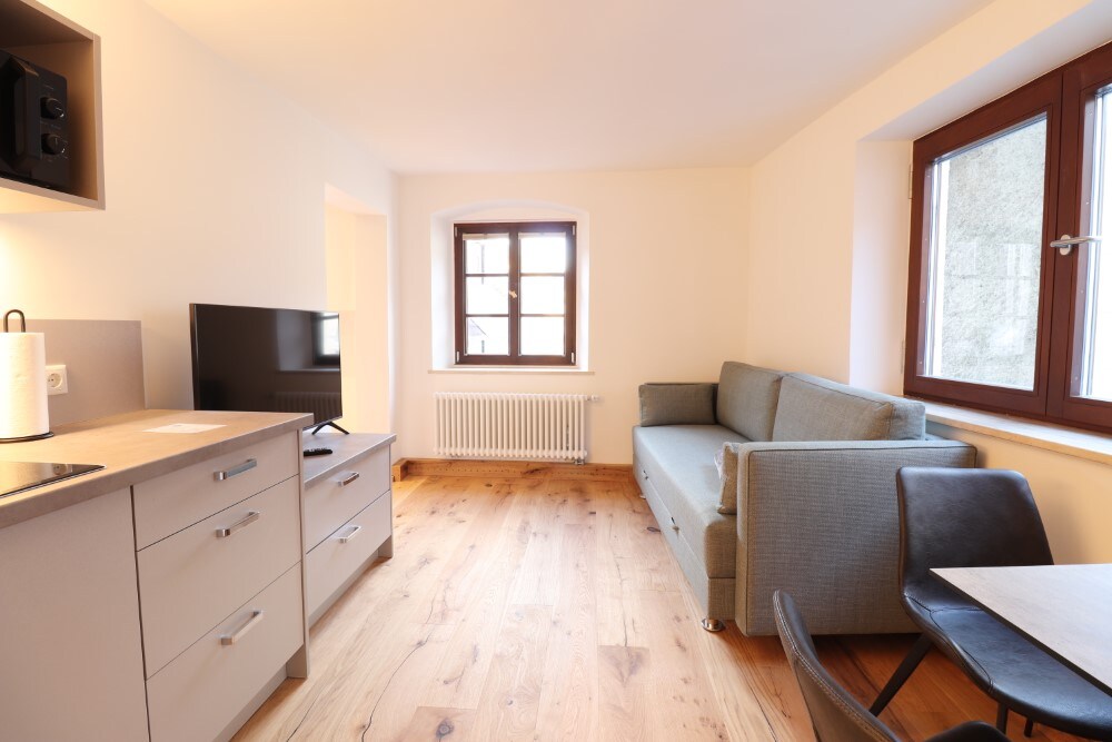 Mit 50-60 m² sind die Standard Maximilian Appartements unsere kleinste Kategorie mit einer voll ausgestatteten Wohnküche, ein gemütliches Sofa mit Schlaffunktion und ein zusätzlicher Loungesessel zum Entspannen. Ein gemütliches Schlafzimmer mit Boxspringbett und ein geräumiges Bad mit begehbarer Regendusche runden den Wohlfühlfaktor ab. Die Appartements sind in verschiedenen Ausführungen und Ausrichtungen (Süd, West oder Nord) verfügbar und auf Anfrage auch zur Einzelbenutzung möglich.