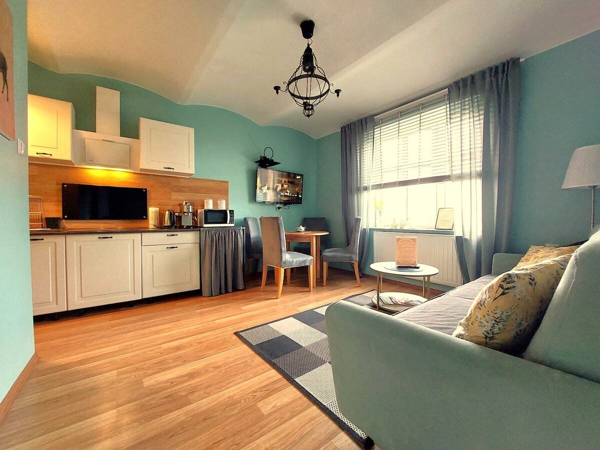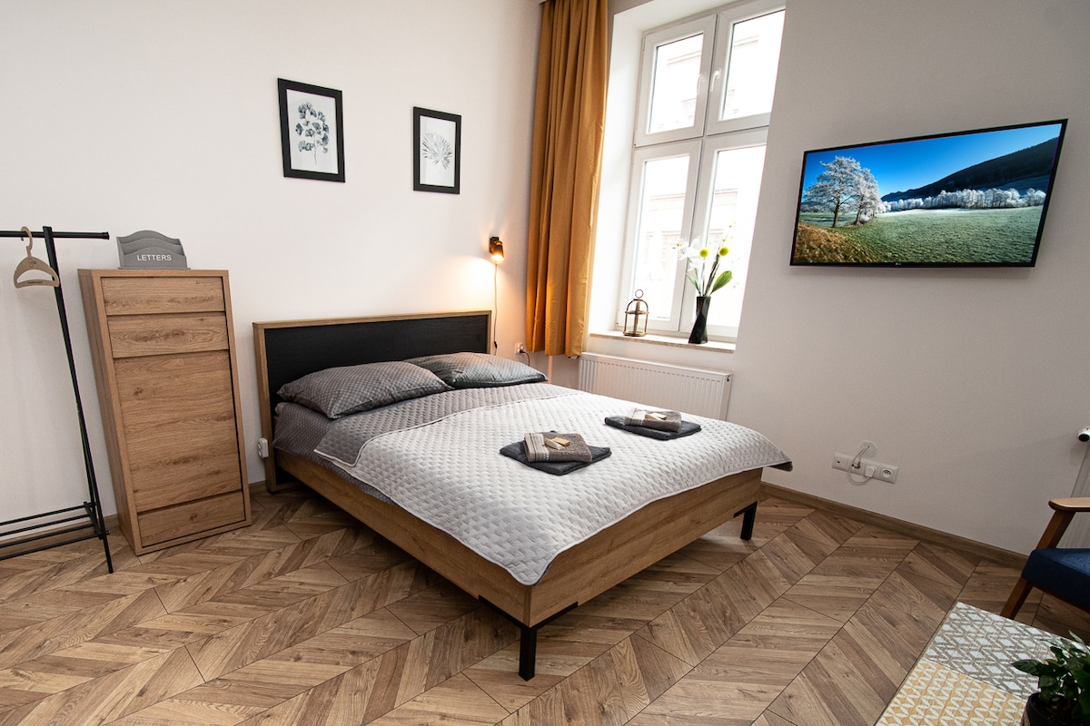 Komfortowy apartament w centrum miasta. Do dyspozycji całe mieszkanie 48 m - sypialnia z podwójnym łóżkiem (szerokość 140 cm) oraz salon z aneksem kuchennym. W salonie rozkładana sofa . W pobliżu główne zabytki miasta. ( 400m ratusz miejski, 950 m - rynek starego miasta, zamek). Dostępne 1 bezpłatne miejsce na prywatnym zamykanym parkingu, tuz obok budynku. Ponadto w pobliżu również miejski parking (od godz.17 oraz w weekendy bezpłatny).