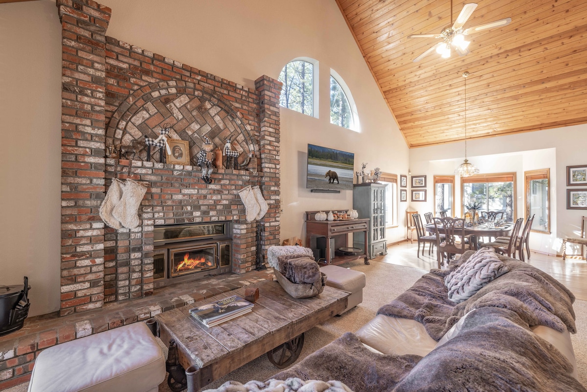 This warm & cozy cabin is just what you are looking for!Brave Stone Cabin is modern and spacious with so many thoughtfully decorated spaces for everyone to spread out or come together.The split level great room features a wood burning fireplace,70"TV,several seating areas,breathtaking wood beam ceilings and a fully equipped kitchen.Enjoy the private deck with BBQ and a fully fenced forested yard!Located in the most desirable area only minutes from the lake,hiking trails,ski resorts and shopping!