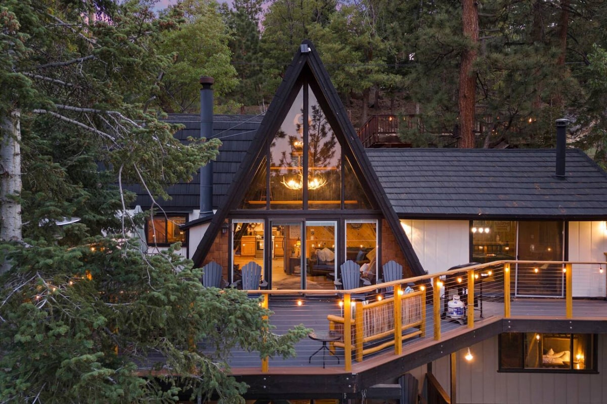 . Walking distance to the Big Bear Mountain Resort . Stunning sunsets from the deck . Pets welcome . Fully Equipped Kitchen w/high end Smeg + Hallman Appliances . A-Frame + Open Concept Lounge/Dining/Kitchen . Large Furnished Main Deck w/ Stunning Lake +Forest Views . Movie Room w/high-resolution projector . BBQ/Grill . Hiking Trails right outside our doorstep . High-speed Wi-Fi + Workspace . Central Heating + Fireplaces . Hot Tub on a covered deck offering privacy + scenic views year-round!