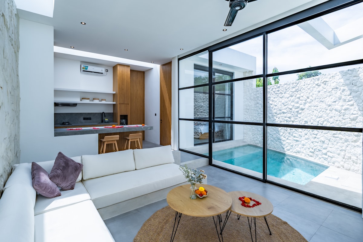 Brand New Designer Villa in Tranquil South Bali • Stylish air-conditioned bedroom with lush tropical views • En-suite bathroom with modern fittings • Large swimming pool surrounded by greenery — perfect for sunbathing or BBQs • Bright open-plan living room & fully equipped modern kitchen • 300 Mbps Wi-Fi for work & streaming • Netflix & PS5 on request • Daily cleaning with fresh towels & linens • Baby cot & high chair on request • Concierge service for airport transfer, scooter rental & more