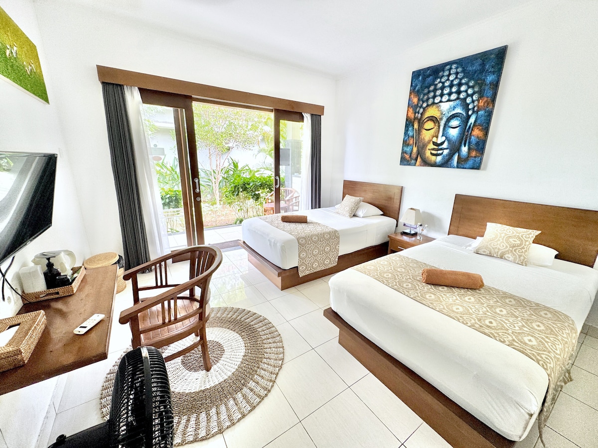 Elegant and cozy, the Essential Room features a queen-size bed, a private terrace with a lush garden, and exclusive access to the shared pool with solarium.—ideal for unwinding in complete tranquility. This room combines Balinese charm with modern comfort, offering a peaceful retreat for guests seeking relaxation and comfort.