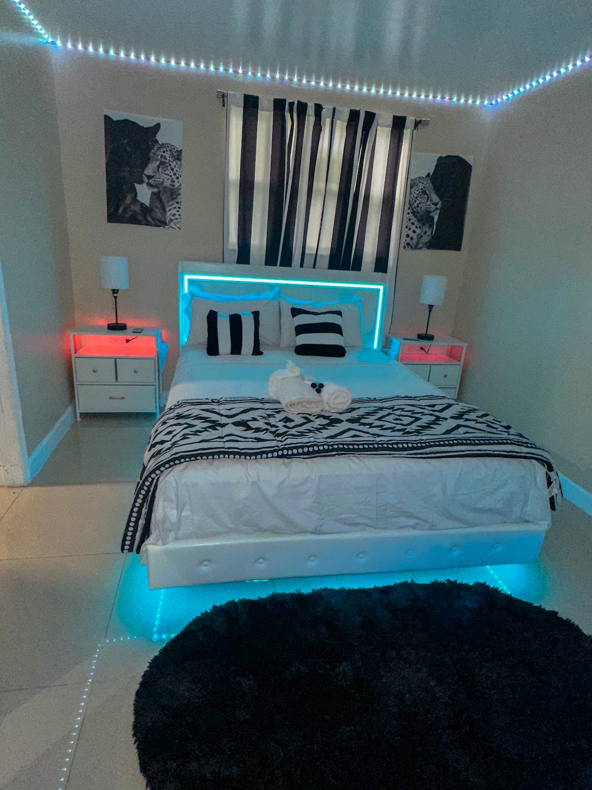 Welcome to The Glow House Miami A modern getaway in Miami Gardens featuring glowing LED accents, chic décor, and cozy touches. Relax in the stylish queen bedroom, sip coffee on the shaded tropical patio, and enjoy secure gated parking. Just minutes from Hard Rock Stadium, dining, shopping, and nightlife, this home is perfect for events, romantic escapes, or city adventures. Unwind in comfort and style while making memories in the heart of Miami.