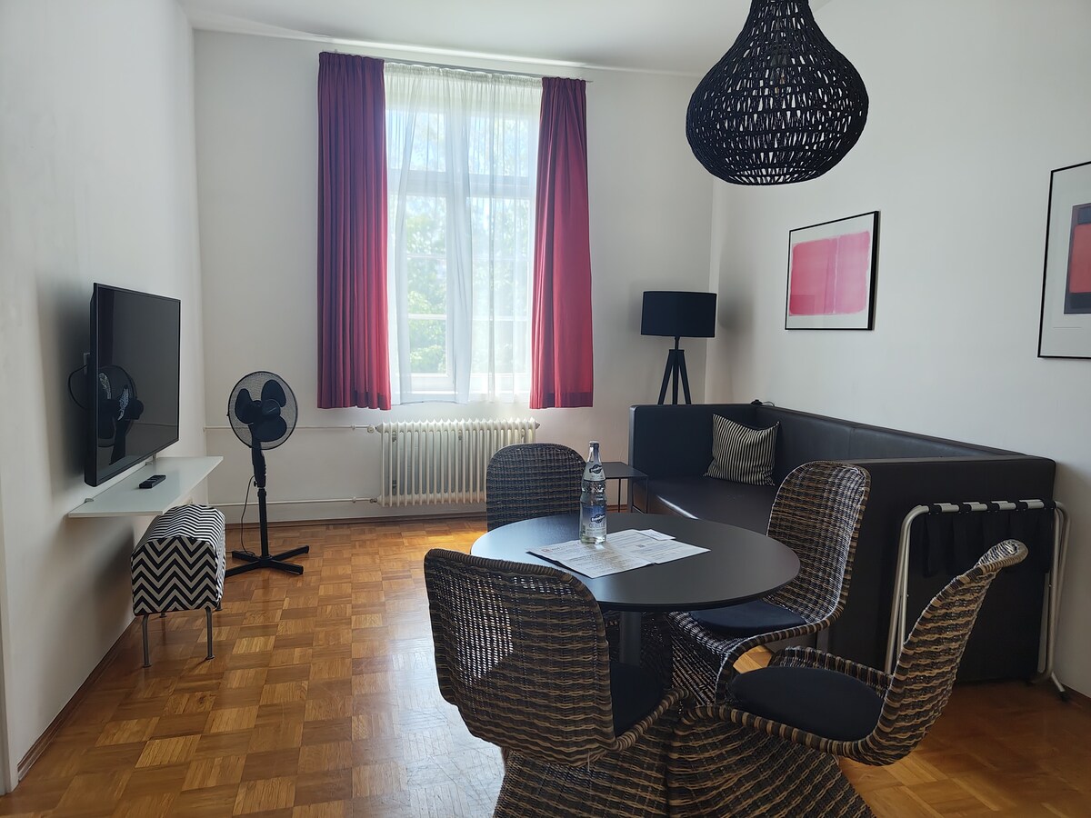 Willkommen in unserem charmanten Studio-Apartment, ideal für Paare oder Freunde. Das Apartment befindet sich in einem ehemaligen Hotel und bietet ein bequemes Bett, ein grosses Schlafsofa und einen Esstisch. Die Küchenzeile ist mit Kühlschrank und Kochplatten ausgestattet. Das Bad verfügt über WC und Badewanne/Dusche. Ein privater Parkplatz steht zur Verfügung. Die Lage ist ausgezeichnet: Nur 10 Minuten zu Fuß zum Rhein und 20 Minuten bis zur Stadtmitte. Wir freuen uns über euren Besuch.