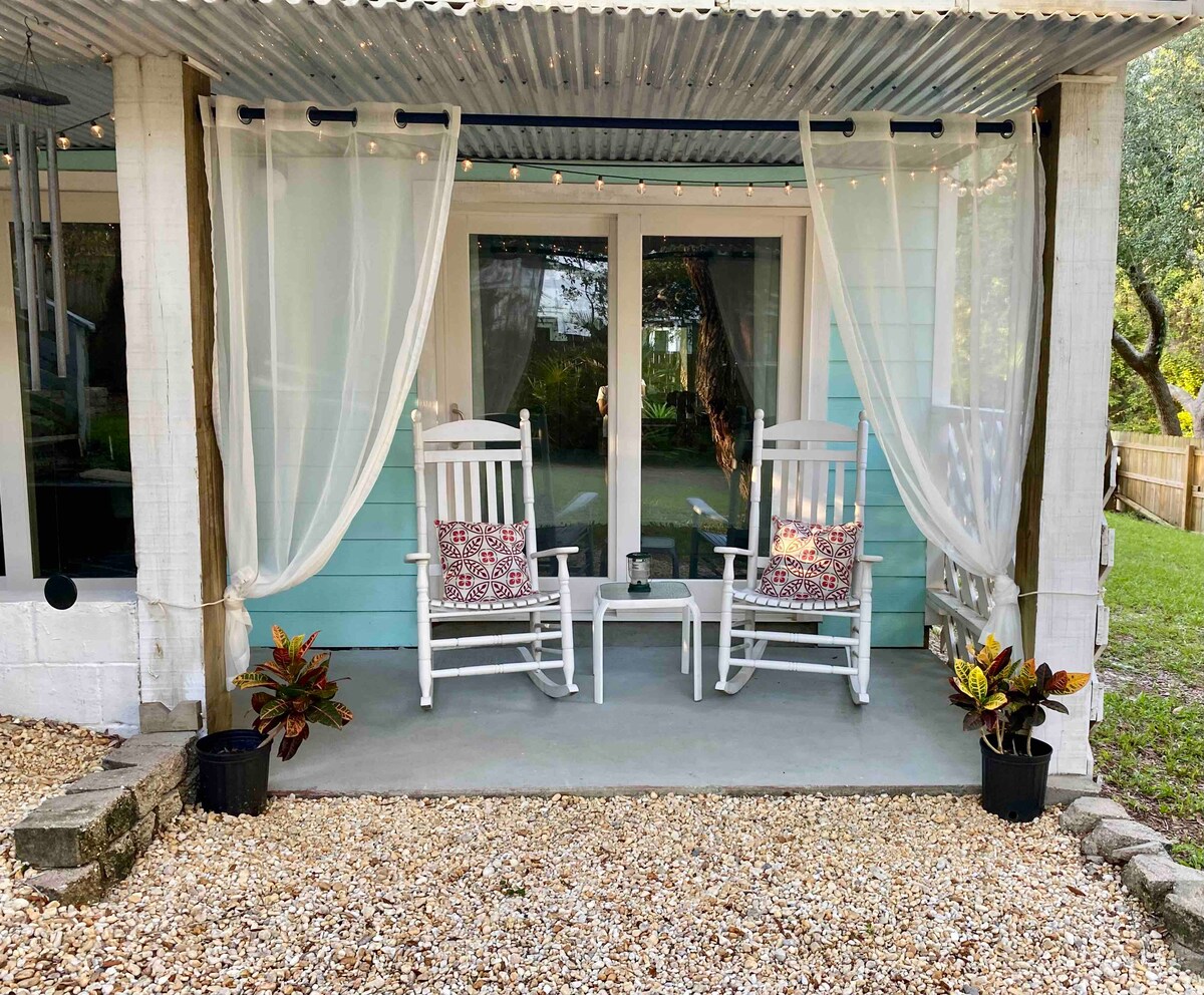 Quaint, cozy, stylish home, off the beaten path and close to everything! Walk to the beach in about 10 minutes or to a restaurant in 5 minutes...to get ice cream, rent bikes in 4 minutes OR hike or bike the Longleaf Greenway Trail that starts 5 minute walk away! Enjoy your coffee or an adult beverage on the back porch with the peaceful view of the tropical yard with ponds. You might even see a little wildlife during your stay…😊 Note: Dog friendly! No children under 10.
